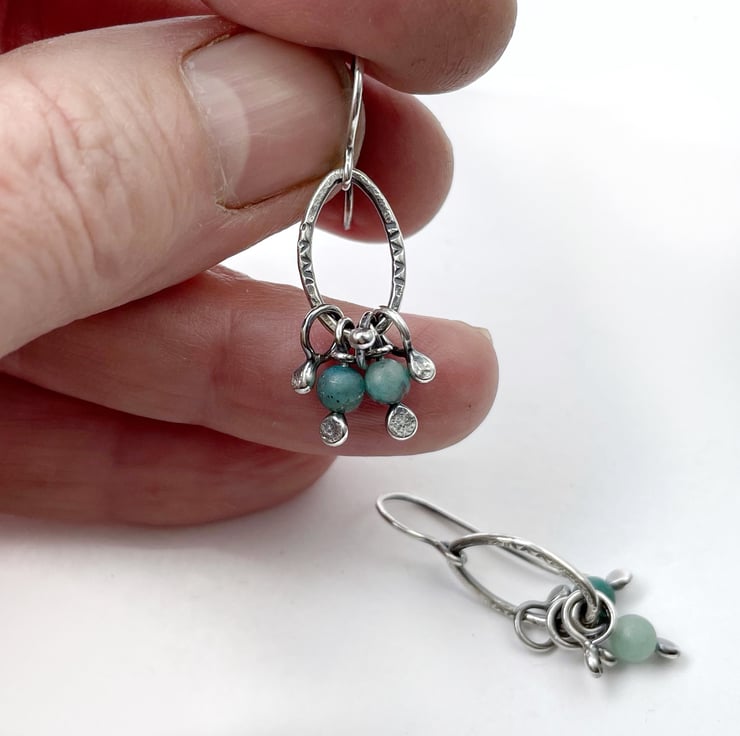 Small lightweight earrings comprising of oval links with a fringe of little dangles, hung from handmade hooks.
