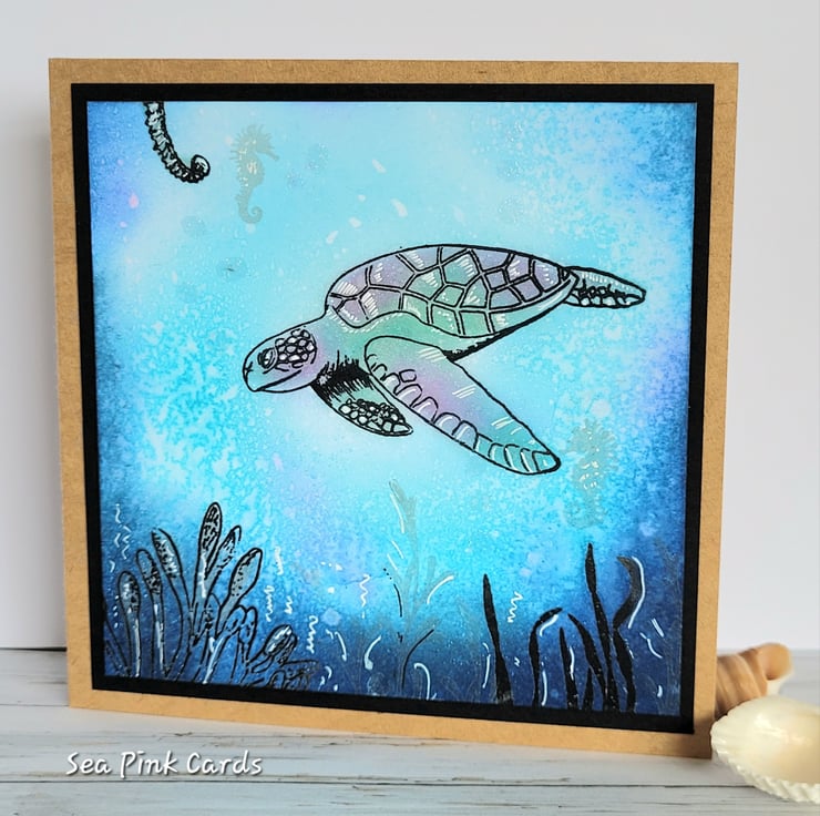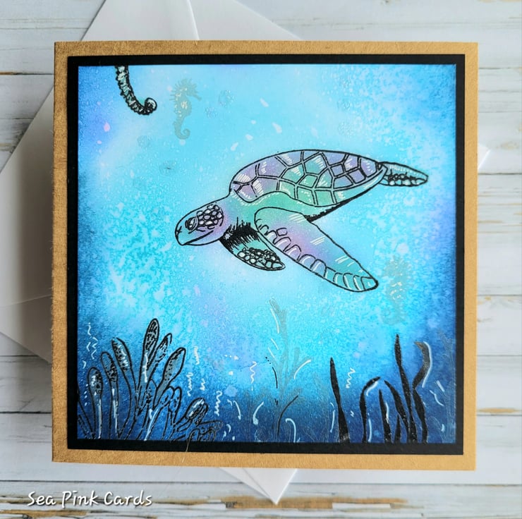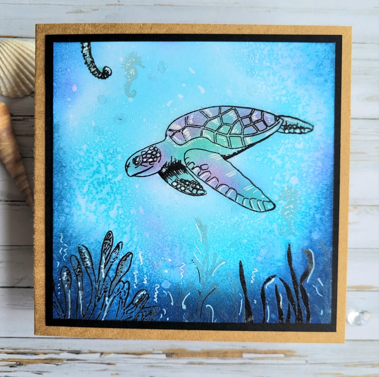 I created this turtle card by hand stamping and heat embossing the main image. I blended the deep sea background with dark blue, light blue and violet blue archival inks and brushes. Details are added with white and black pigment ink fine liner pens and there are water droplets and splashes. Little sea horse images and sea grass are stamped with water-based silver ink, they shimmer when the card catches the light.