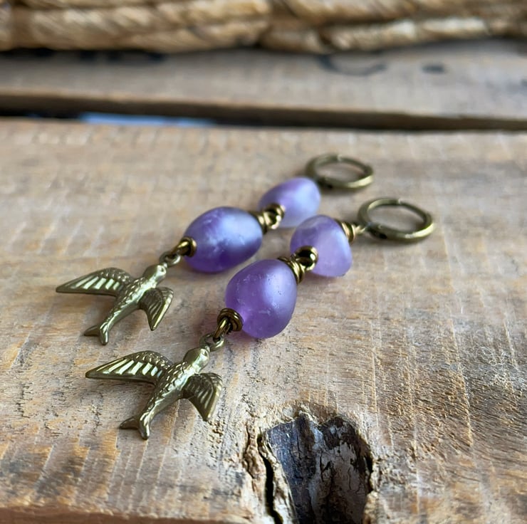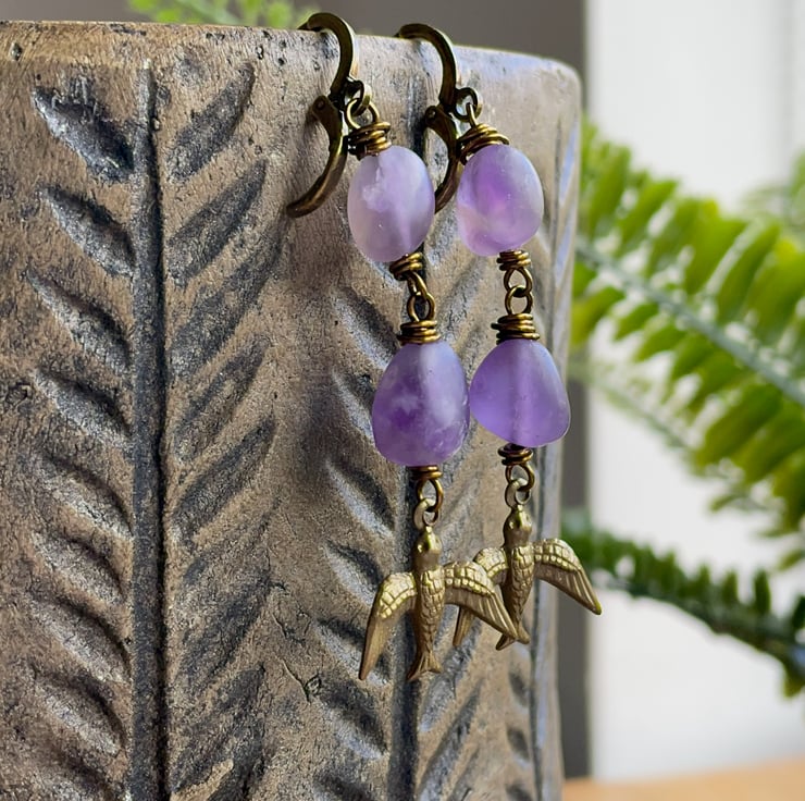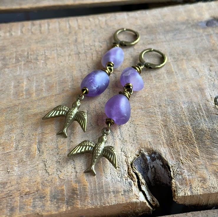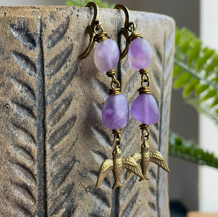 These bohemian-style earrings feature matte amethyst-purple coloured stones, paired with beautifully detailed Vintaj brass flying bird charms.