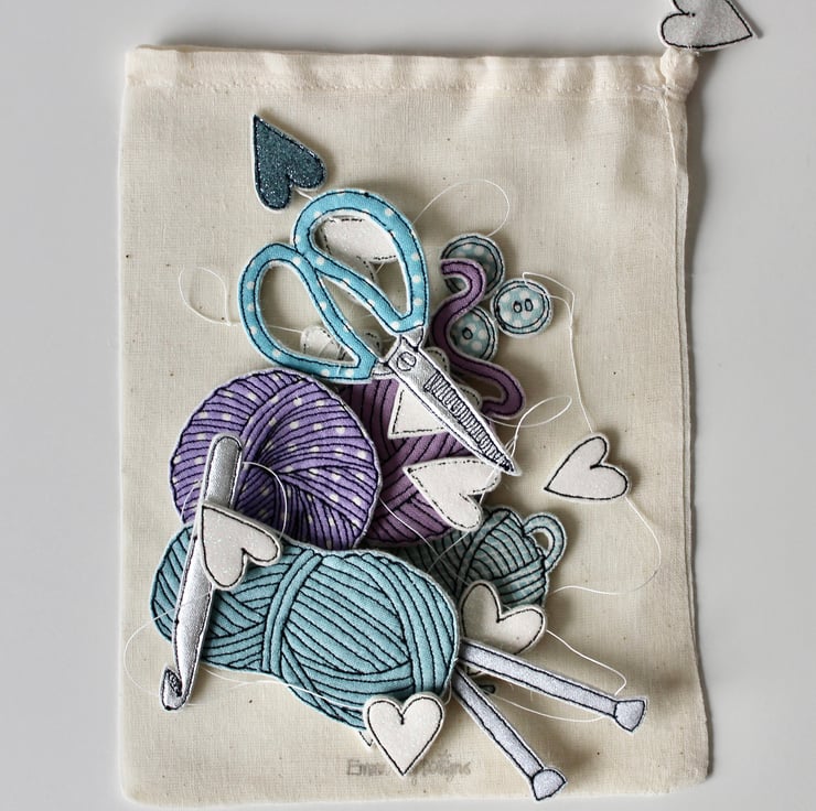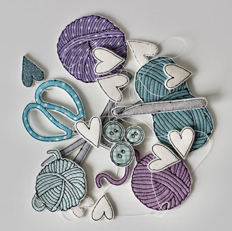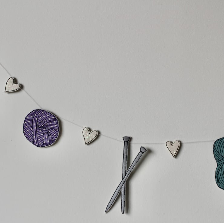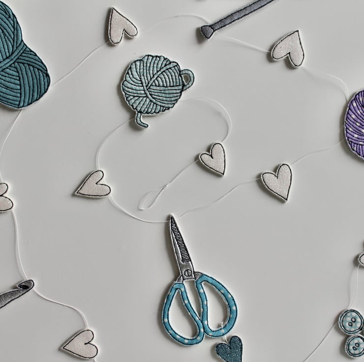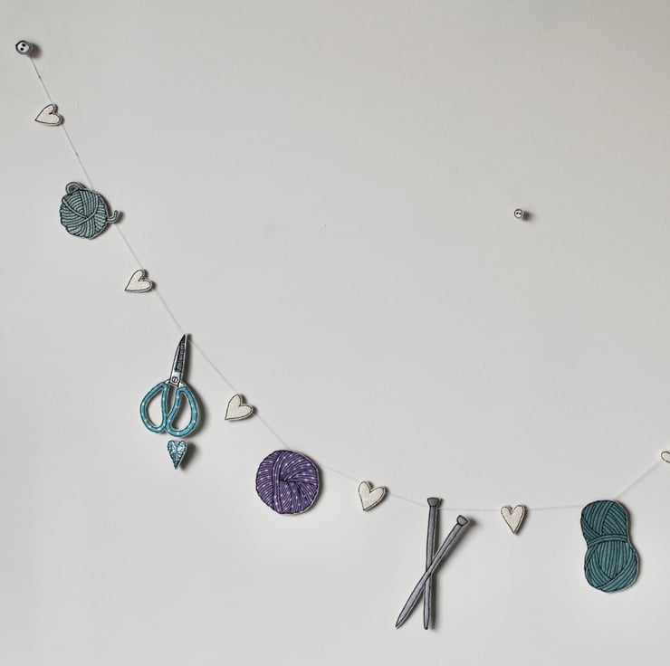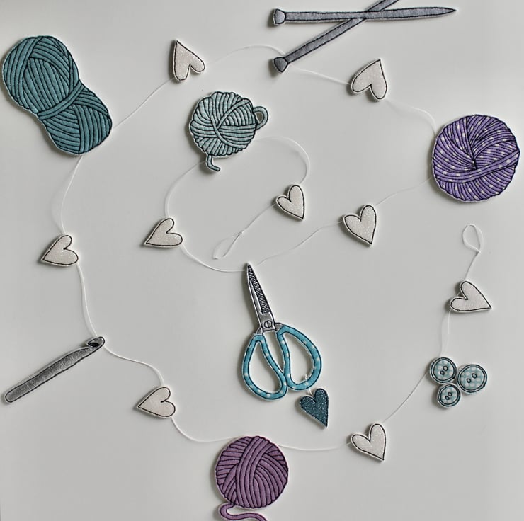 The yarn, knitting needles, crochet hook, scissors, buttons and hearts suspended along this garland, are sewn using a combination of 100% wool felt, cotton cloth, glitter cloth and free hand machine embroidery; multiple layers of cloth are sewn together and cut out by hand using very sharp scissors.