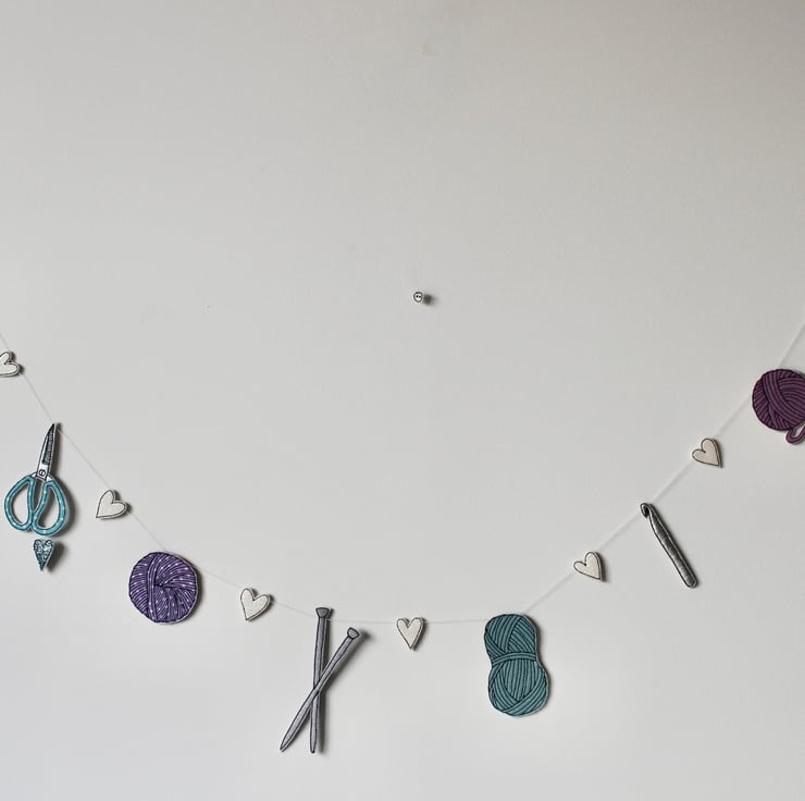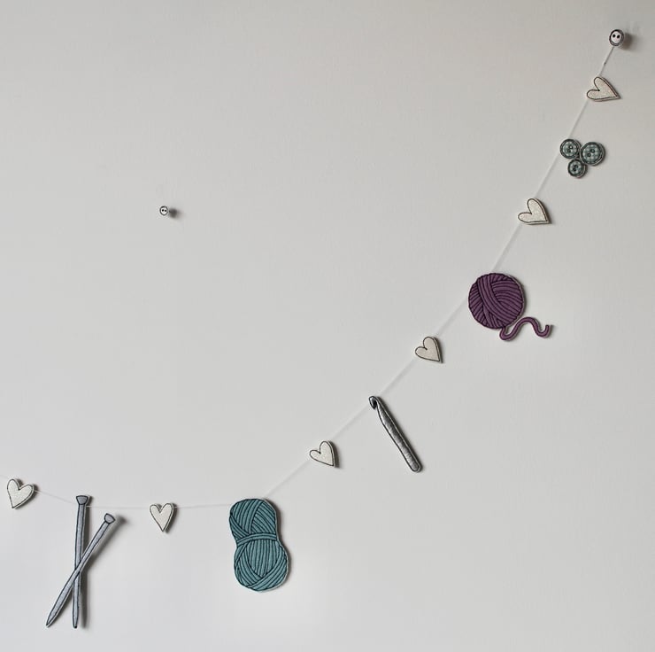 The yarn, knitting needles, crochet hook, scissors, buttons and hearts are suspended on a linen thread and can be moved along the length, allowing a little creativity with spacing.