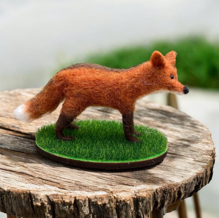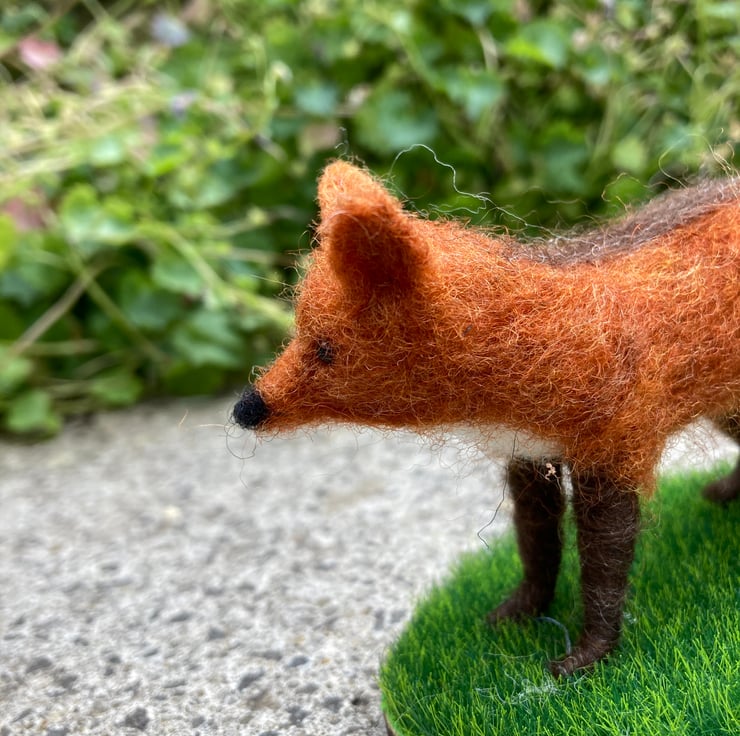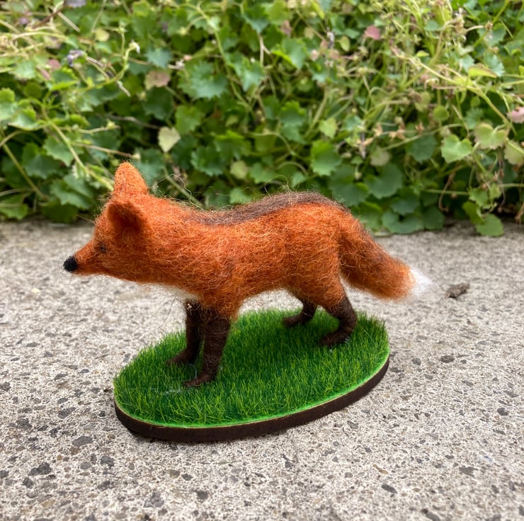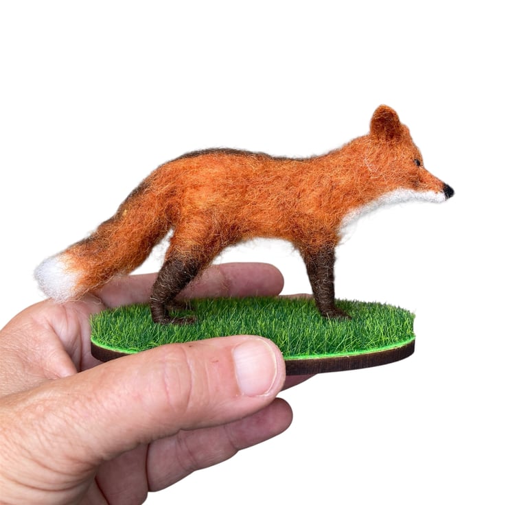 This woollen sculpture of a fox is a mini version of one listed elsewhere in my shop. The fox has been needle felted using woollen fibres and a barbed felting needle that binds the fibres together and sculpts them into shape. White core fibres form the basic shape after which a top coat of red fox coloured wool fibres is added. The fluffy tail and legs have been made over formers to add strength and stability and the eyes are beaded.
