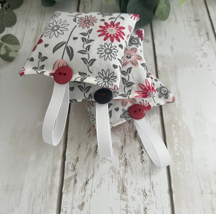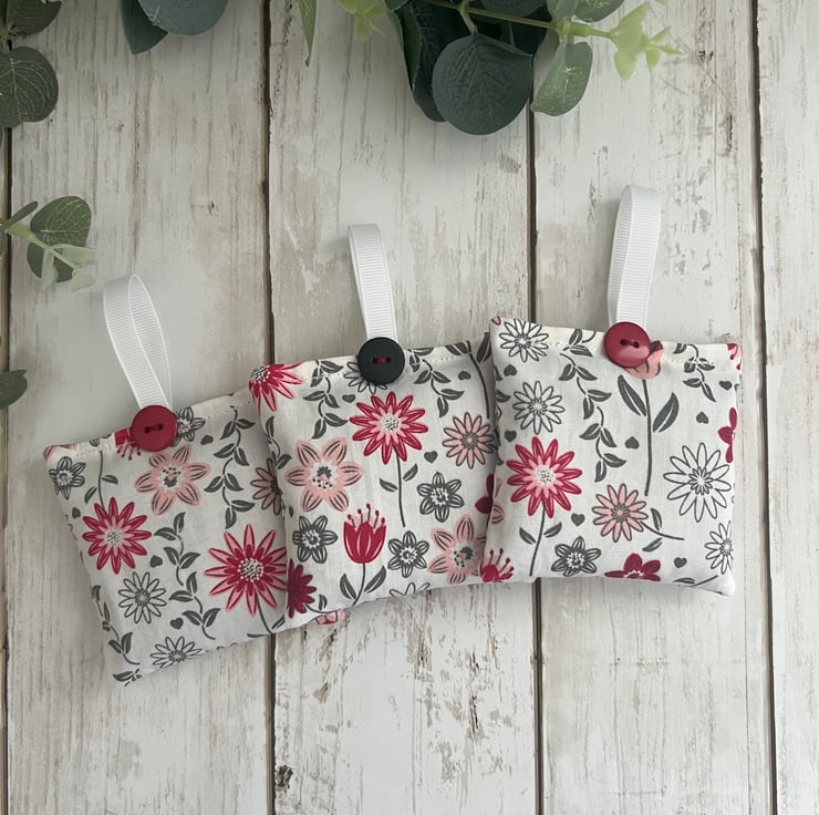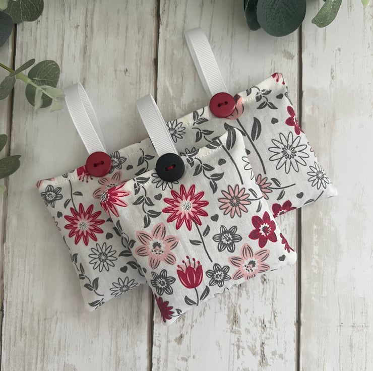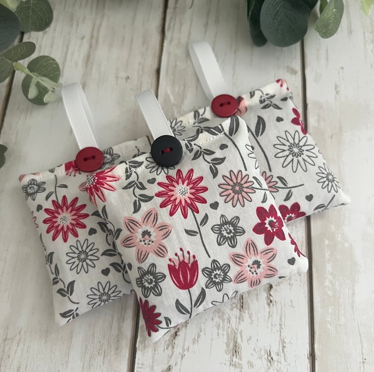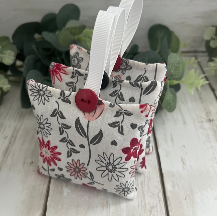 The sachets have been finished in lovely cotton fabric-dark red, grey, pale pink & white florals to the front and to the back, finished with a co-ordinating button and white grosgrain hanging ribbon. Pattern placement may vary on each sachet, but I try to ensure there is a good pattern to both sides.