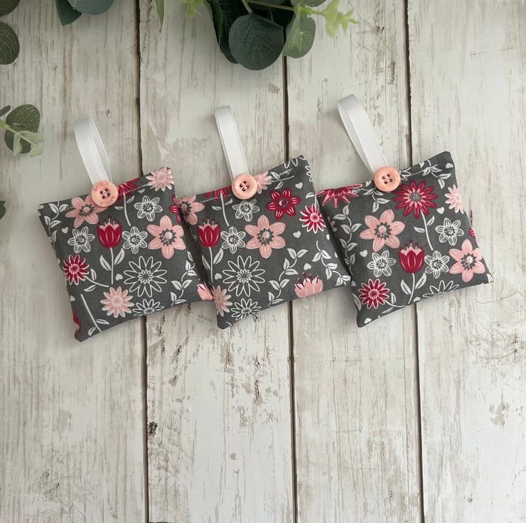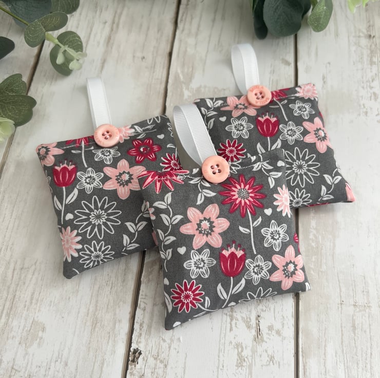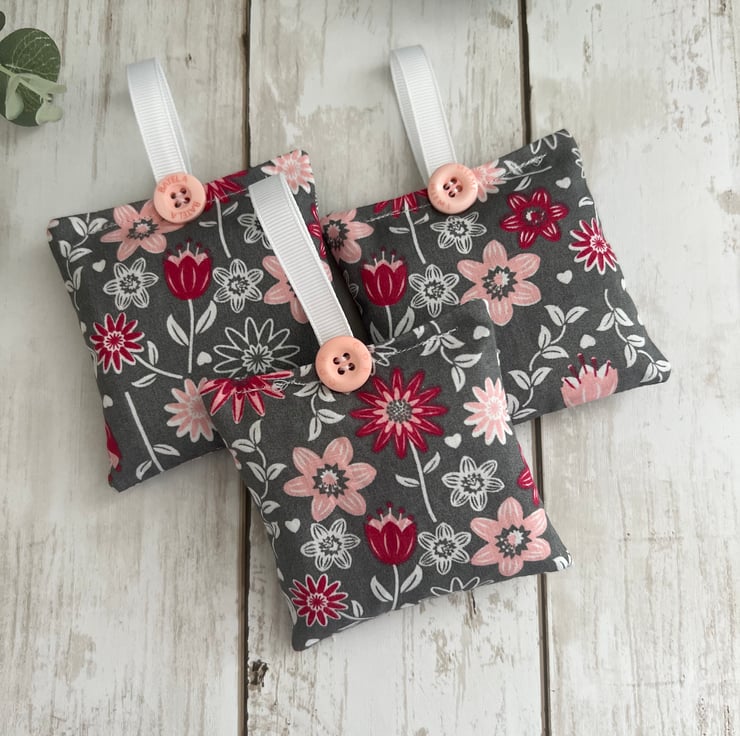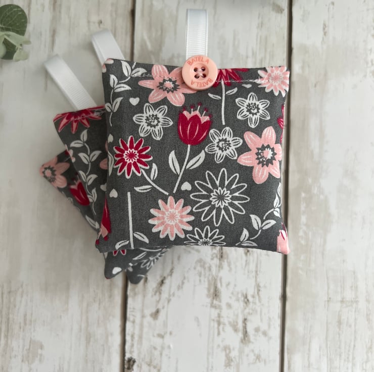 The sachets have been finished in lovely cotton fabric-dark red, grey, pale pink & white florals to the front and to the back, finished with a pale pink button and white grosgrain hanging ribbon. Pattern placement may vary on each sachet, but I try to ensure there is a good pattern to both sides.