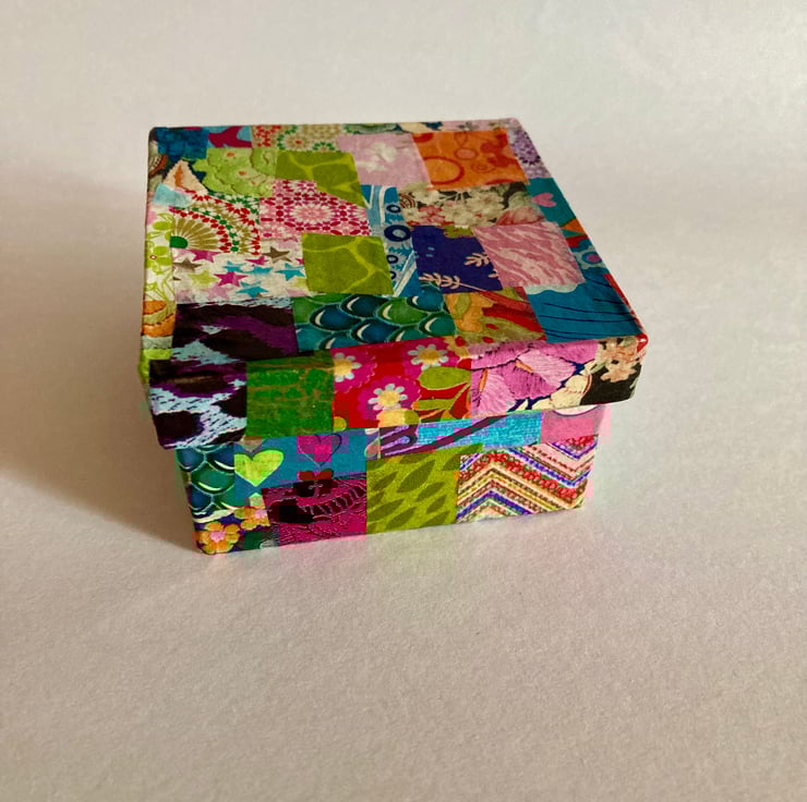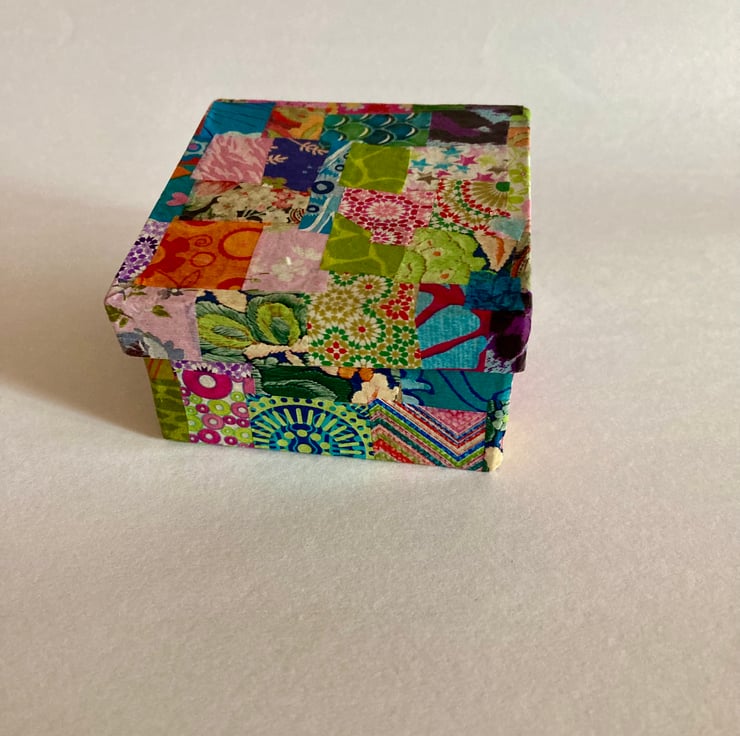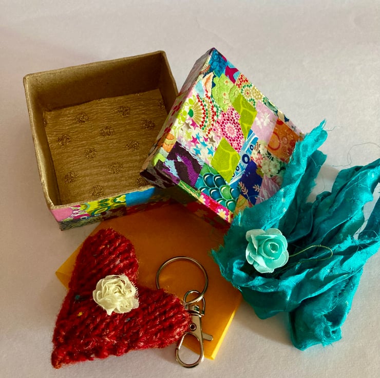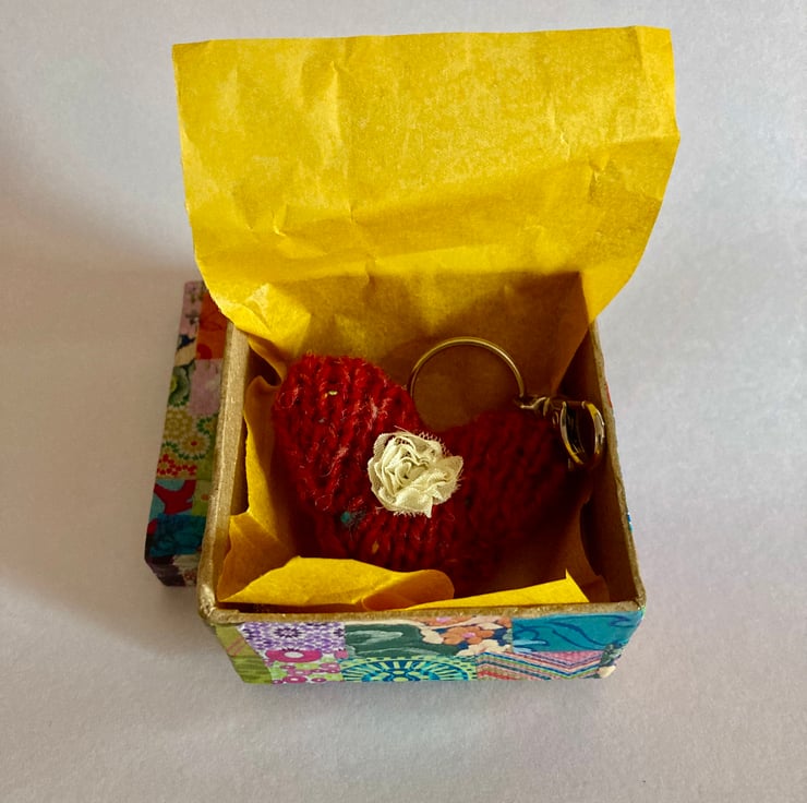 This is a pretty decopatch box with a hand knitted pure new wool heart key ring inside. The box has been covered in cut colourful decopatch papers on the outside and varnished all over.