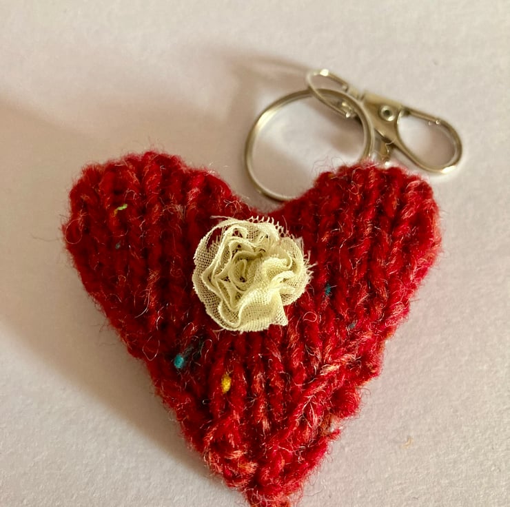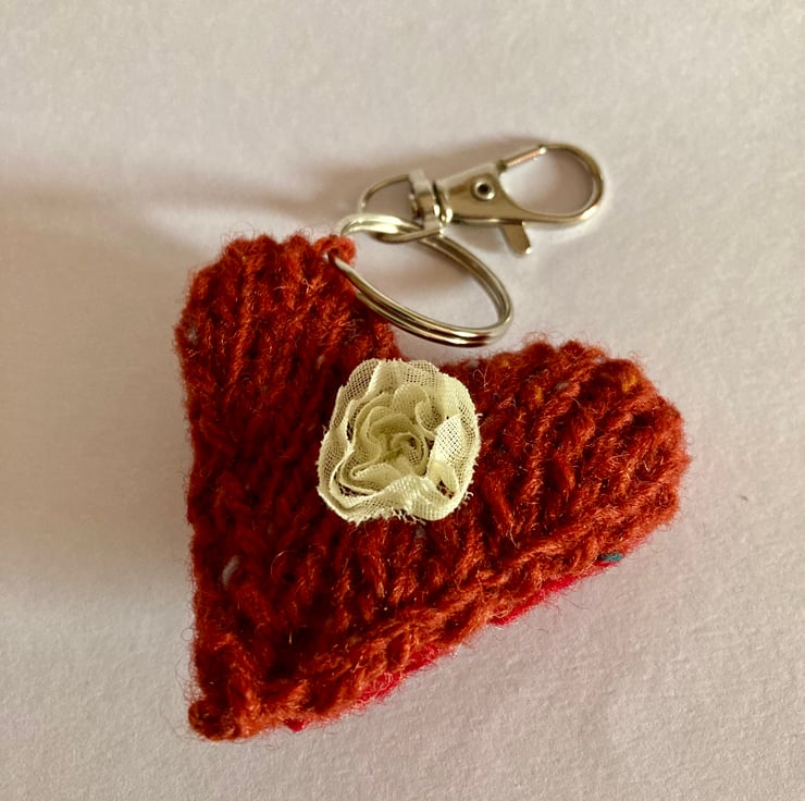 A hand knitted heart of 100% double knitting New Lanark wool. One side is knitted in the russet colour with the other side in foxglove and it is attached to a silver lobster clasp. An ivory flower with has been sewn on to both sides.