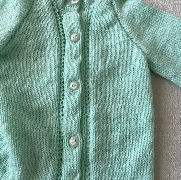This mint coloured baby cardigan has been hand knitted in a soft 4ply yarn. using a vintage French pattern.