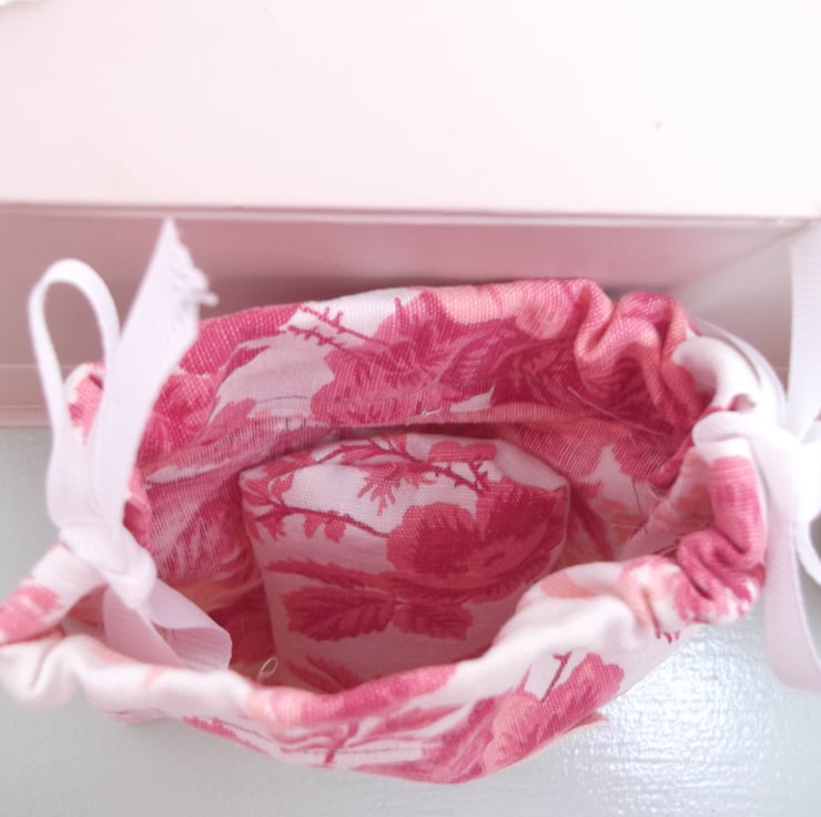 Handmade Lavender bag. Vintage cotton fabric drawstring bag with white ribbon ties with a lavender filled sachet insert. Pink floral pattern.