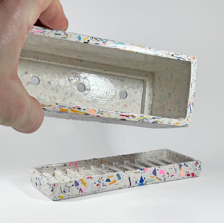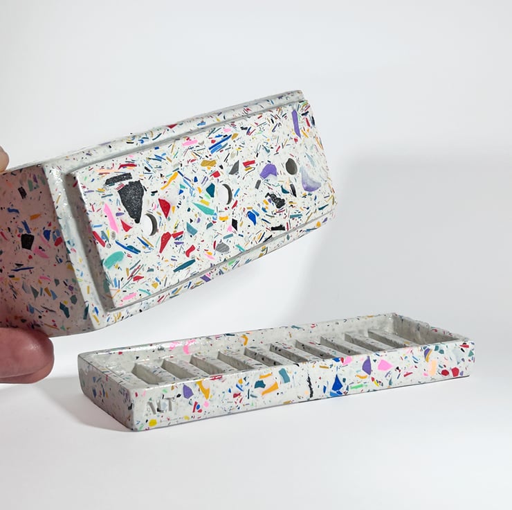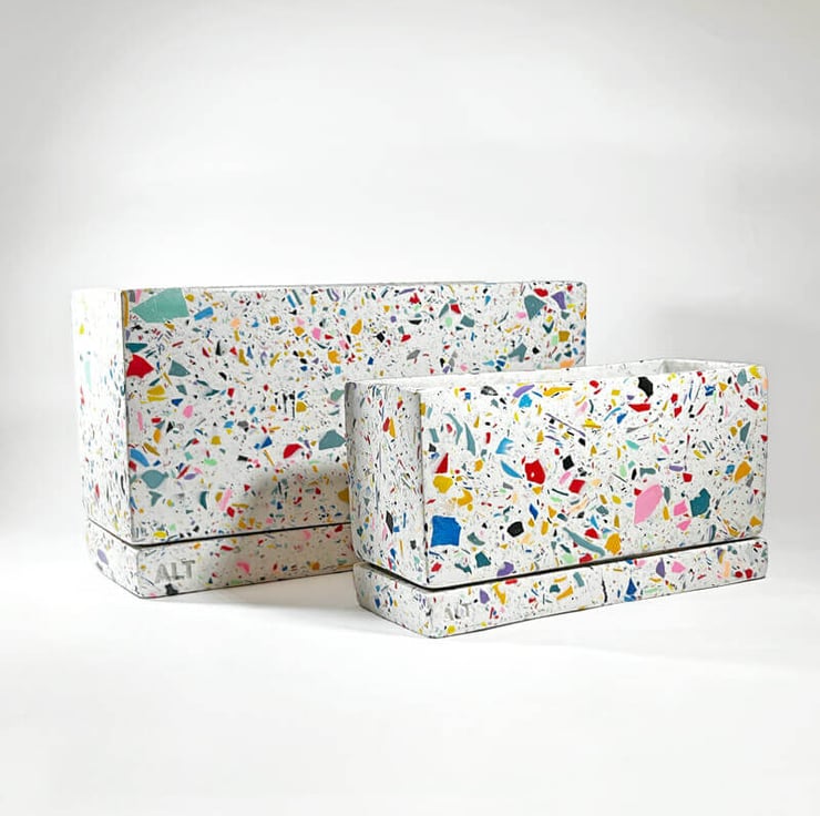 This plant pot was the very first product I ever created. I envisioned a functional yet stylish rectangular planter with drainage holes and a separate water tray—perfect for encouraging healthy root growth indoors, whether on a sunny windowsill or in the kitchen. To bring this idea to life, I taught myself 3D design software and used a 3D printer with biodegradable filament to produce the initial prototype. From there, I crafted a mould, allowing me to create bespoke plant pots in any colour combination. Our rainbow terrazzo finish has quickly become our most popular style, celebrated for its bold colours and minimalist design. Available in two sizes, this planter is a piece we’re truly proud of—combining practicality, sustainability, and vibrant contemporary style