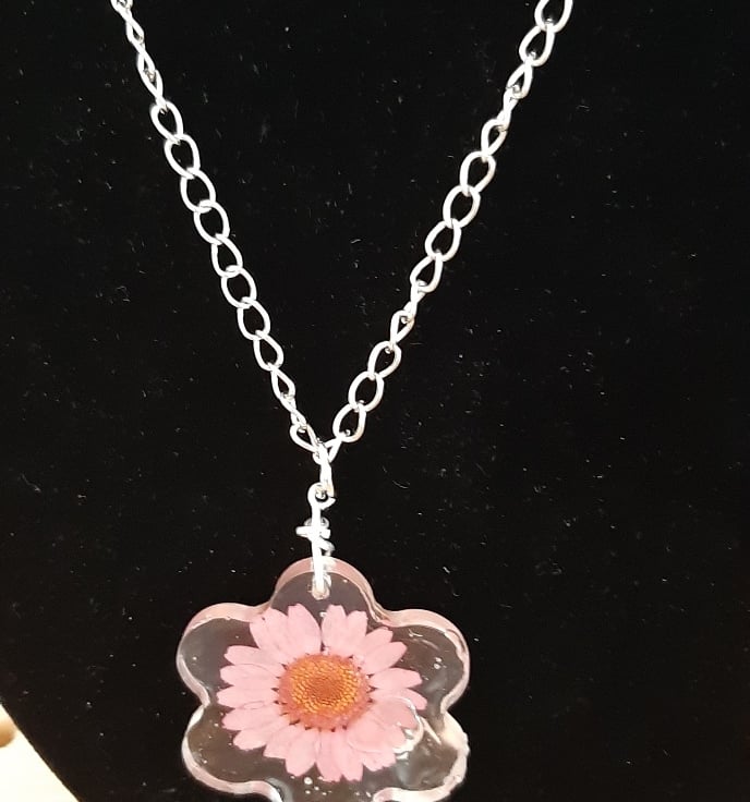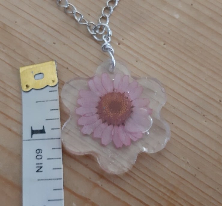 Flower-shaped resin pendant on a long, 19.5 inch silver coloured chain.