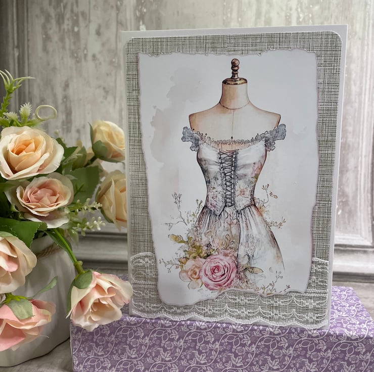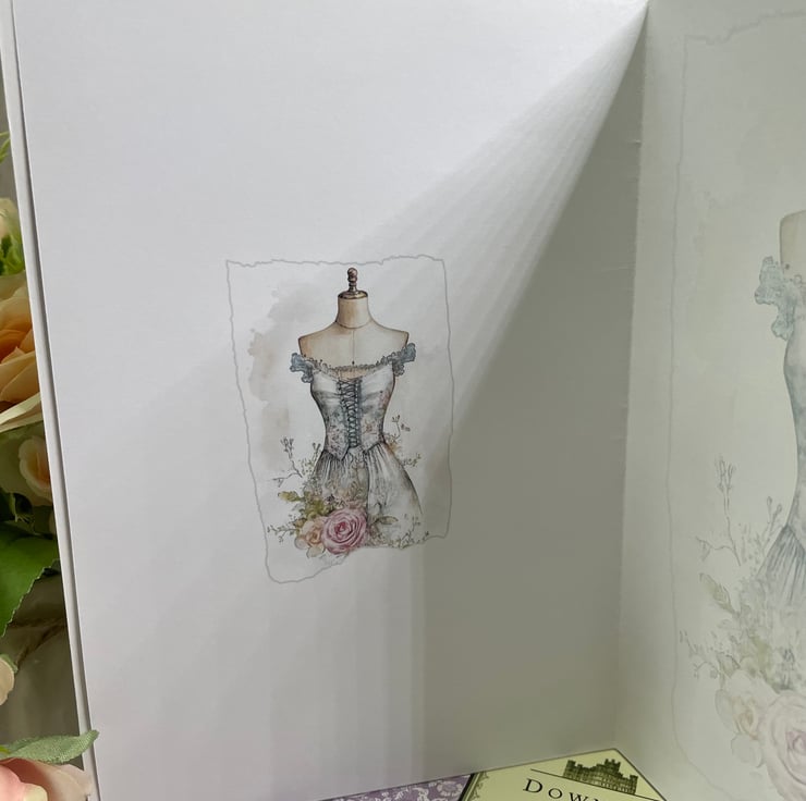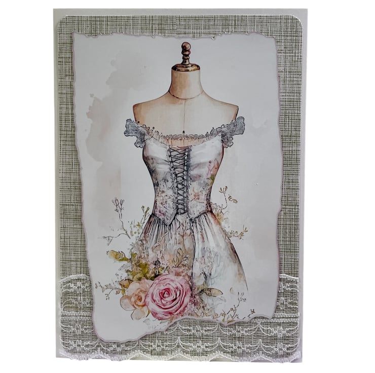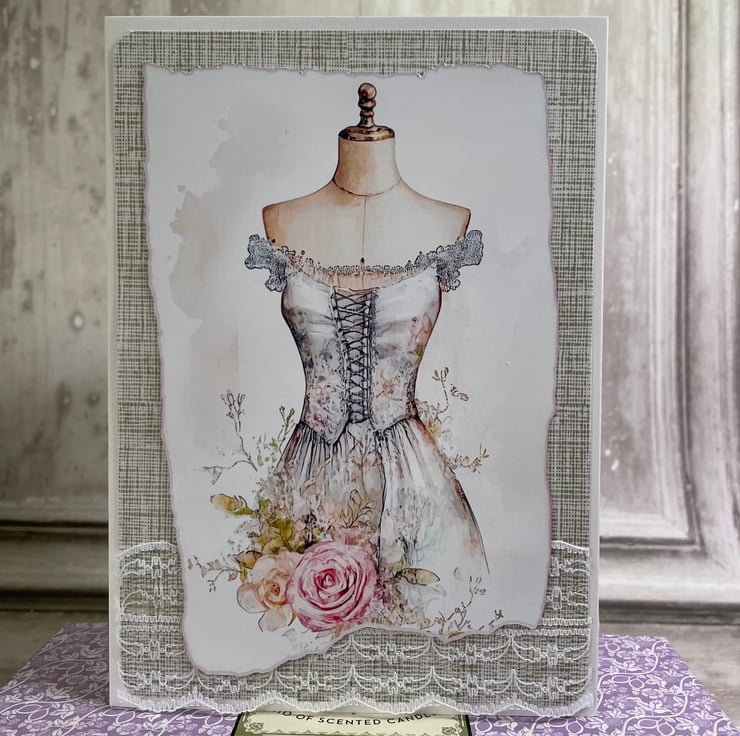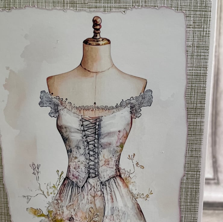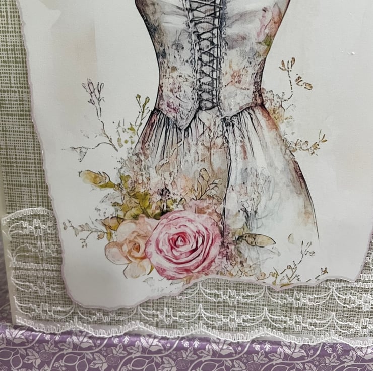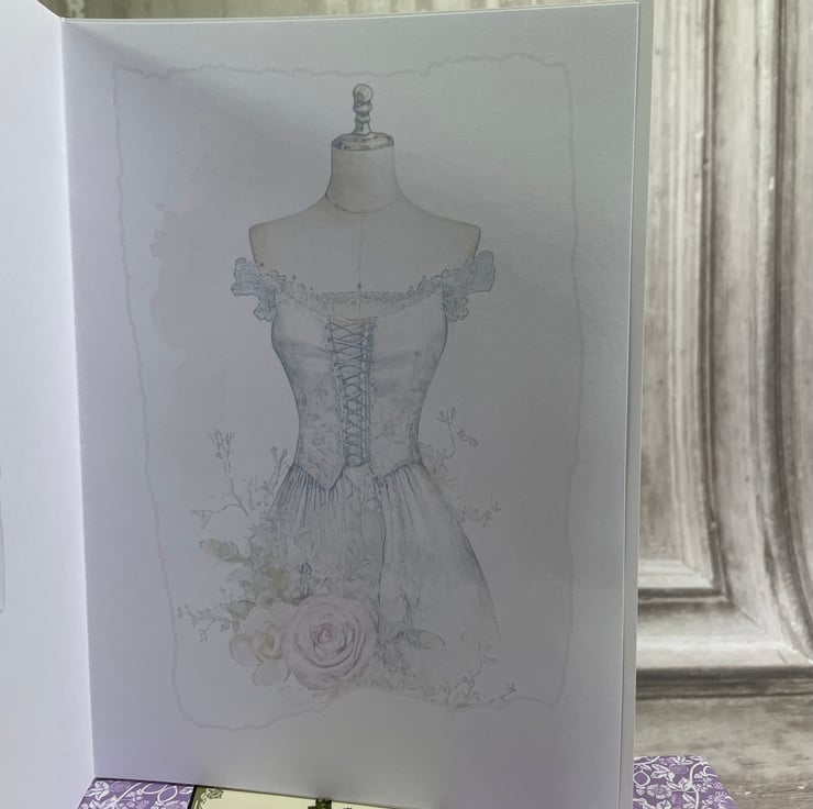 5 x 7” white card and envelope. Background a grey scratched design, lace across the bottom and a topper of. Beautiful fantasy dress on a watercolour style. Rose detail, topper edged with lilac. The inside had been left blank for your own message. White insert with mini copy of the dress on the left and a shadow of the dress on the right.