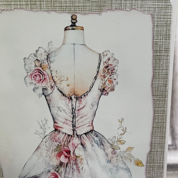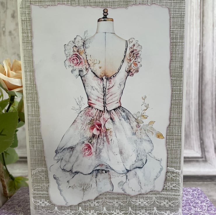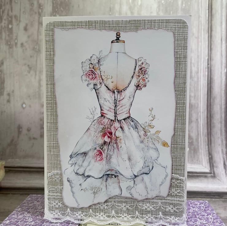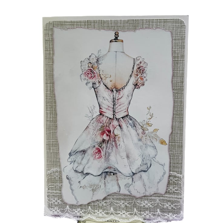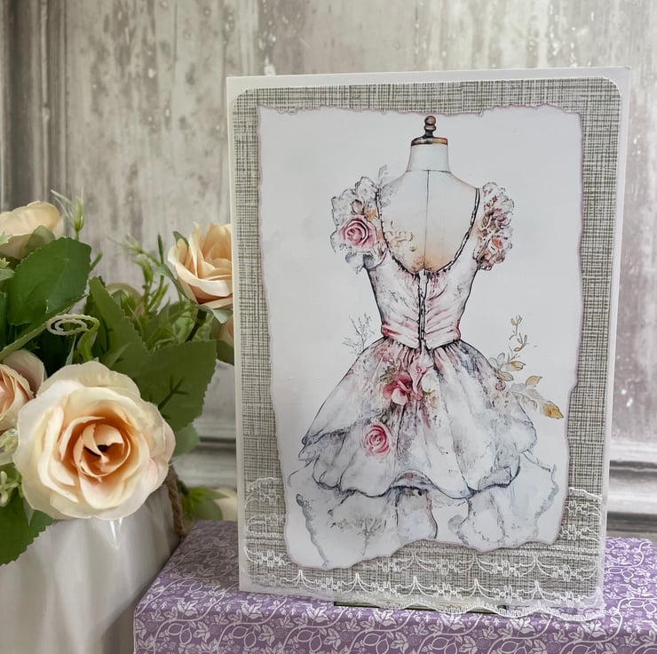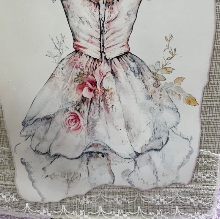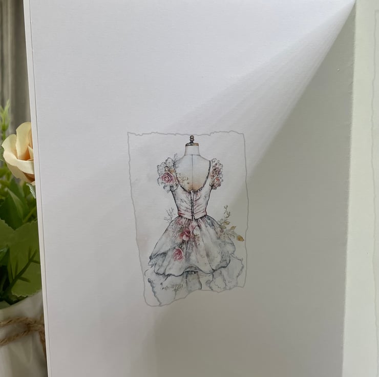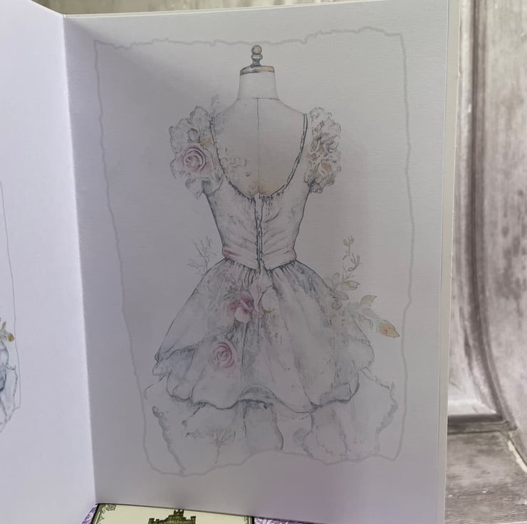 5 x 7” white card and envelope. Background a grey scratched design, lace across the bottom and a topper of. Beautiful fantasy dress on a watercolour style. Rose detail, topper edged with lilac. The inside had been left blank for your own message. White insert with mini copy of the dress on the left and a shadow of the dress on the right.