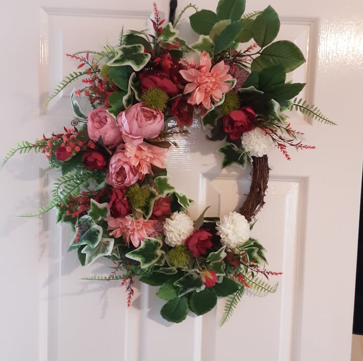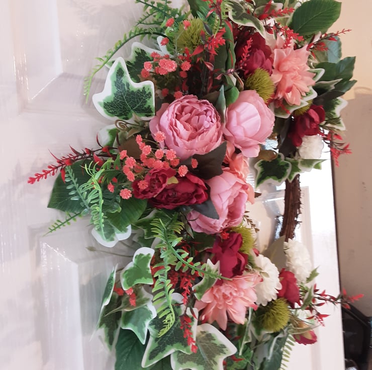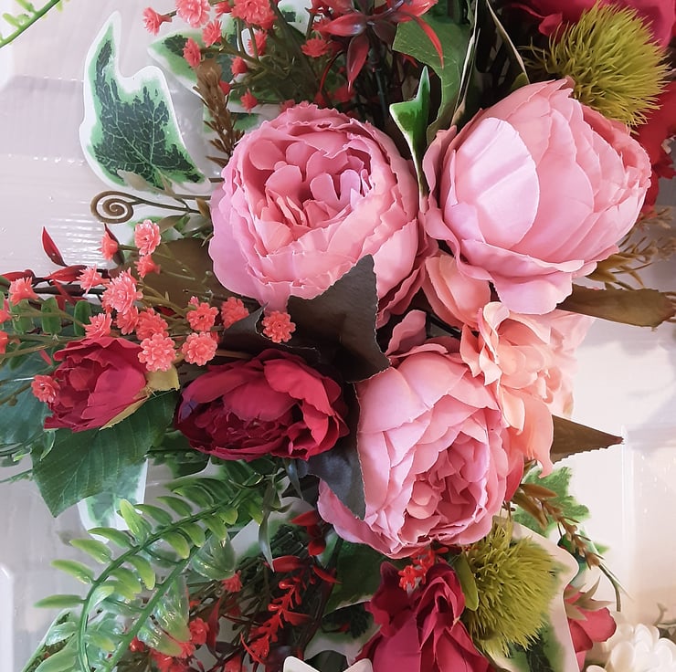 Half covered wreath. Pink peonies, dahlias, white chrysanthemums, red roses .Green and red foliage