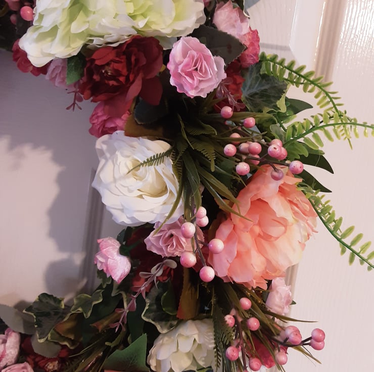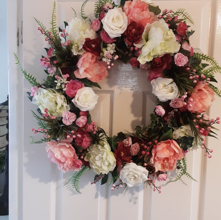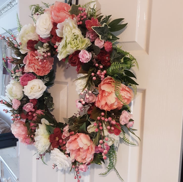 56cm colourful wreath, green foliage, lime green and coral peonies red crabs claw, pink roses and berries