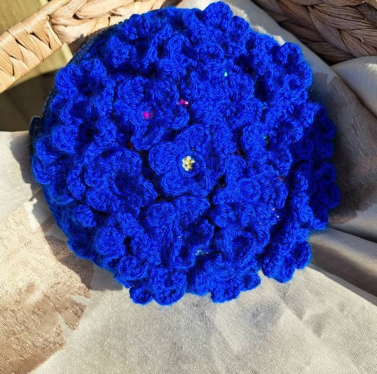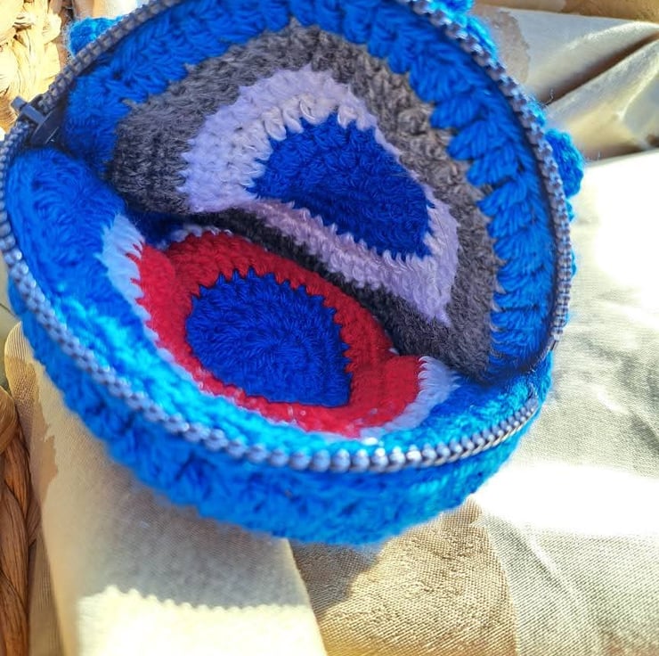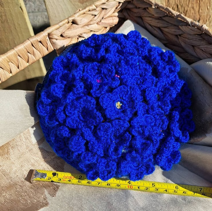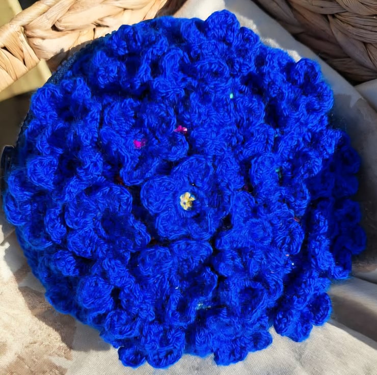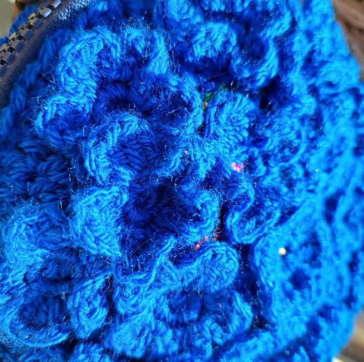 Beautiful crochet purse. Covered in crochet flowers. Under the flowers are hand sewn sequins that peek through the middle and under the petals. Zip closure, foam inside for structure. Keep dry and away from velcro
