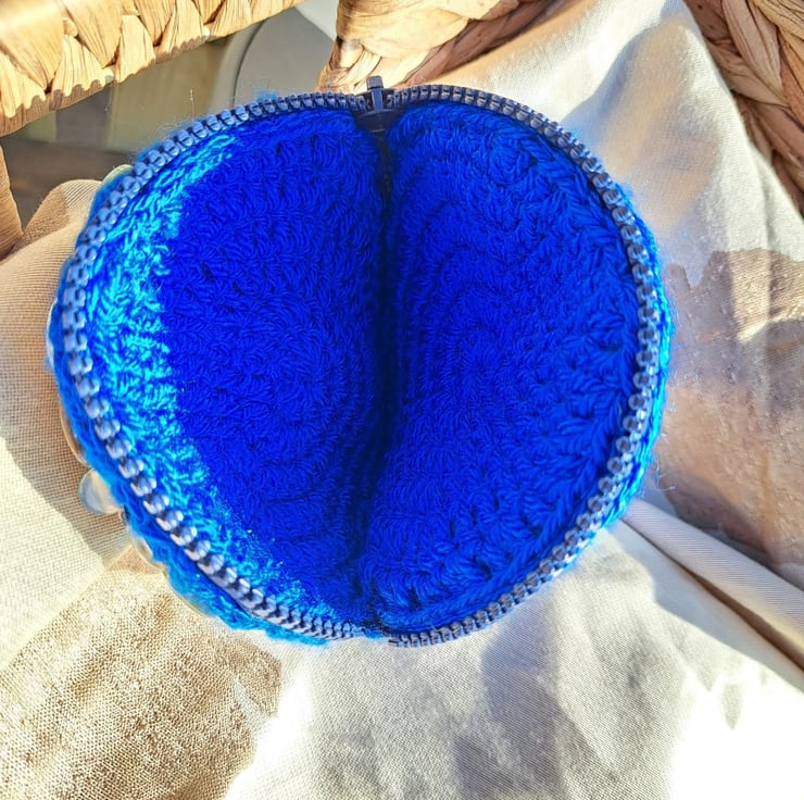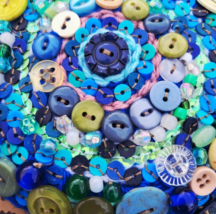 Beautiful purse inspired by the ocean. Covered in vintage buttons, beads and gemstones. Zip closure. Keep dry and away from velcro