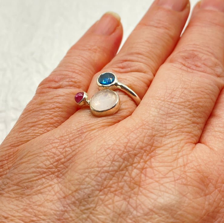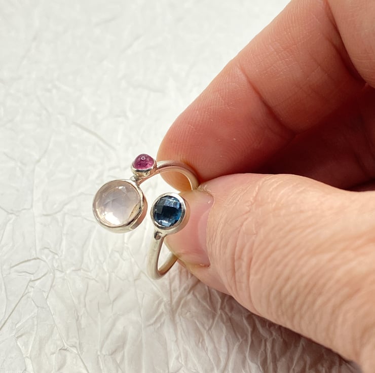 Rose Quartz sits along side a bright pink tourmaline and inky London blue topaz. This adjustable ring is one of a kind, handmade in my studio. It can be sized up or down by about a half a size.