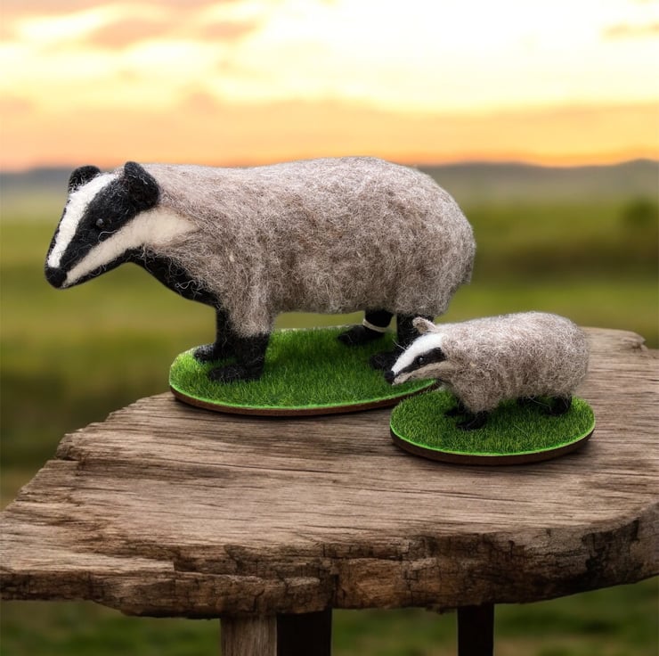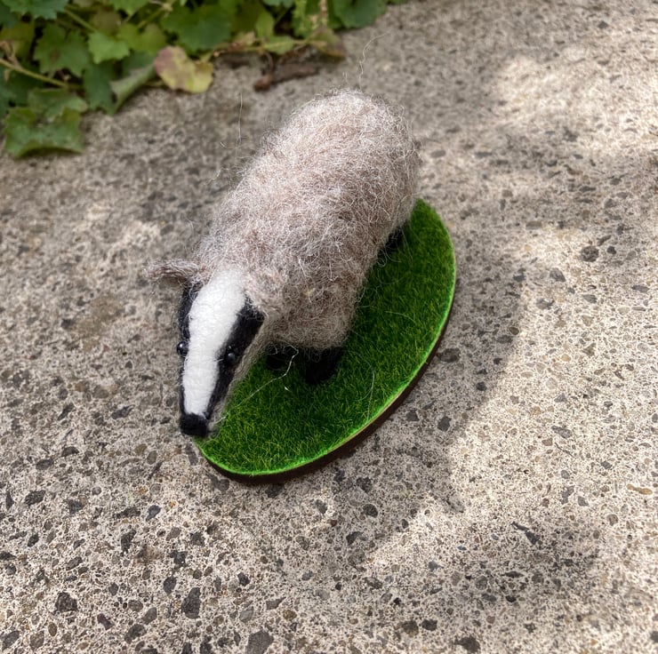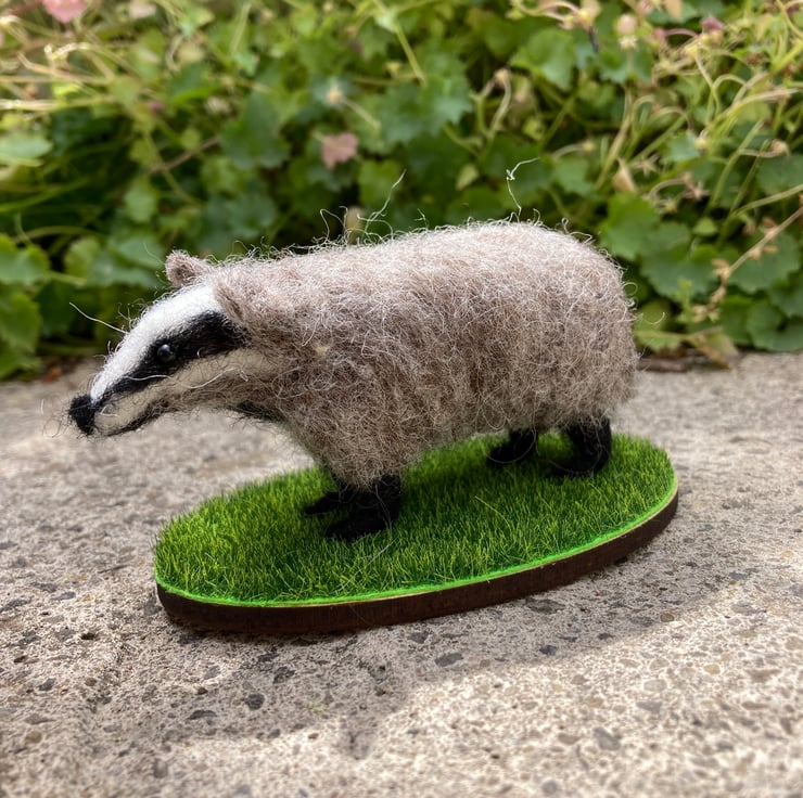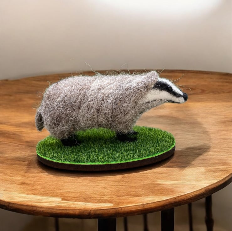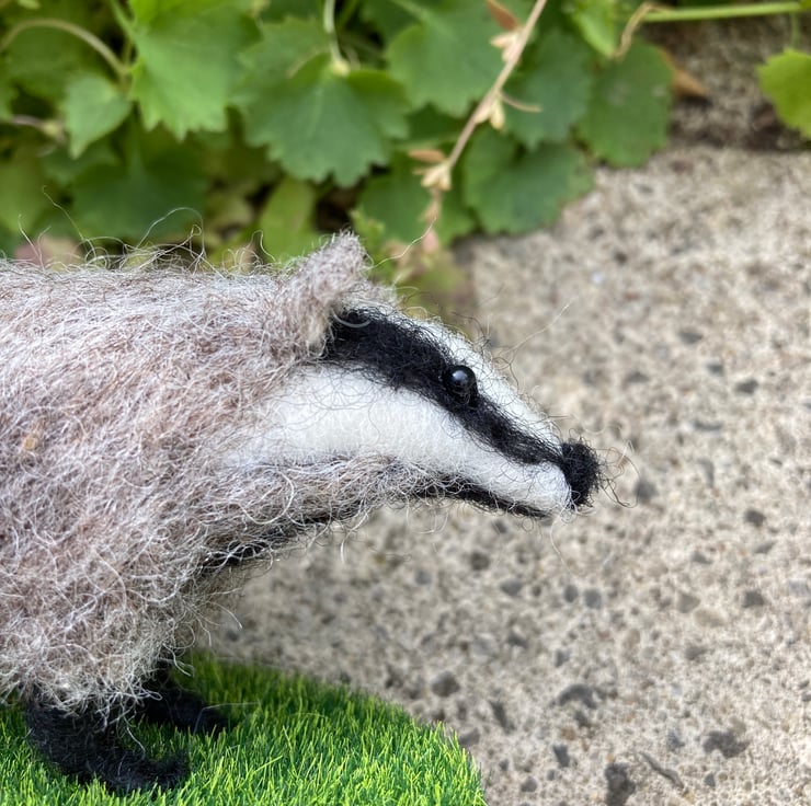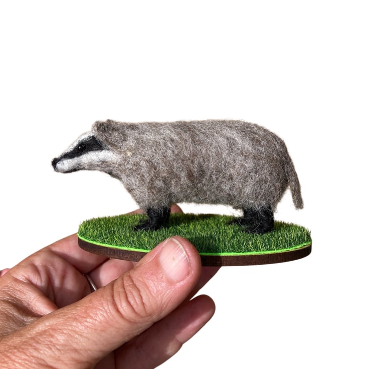 A mini version of a woollen sculpture of a badger. This badger has been needle felted using woollen fibres and a barbed felting needle that binds the fibres together and sculpts them into shape. White core fibres form the basic shape after which a top coat of appropriately coloured wool fibres is added. The legs have been made over wire formers to add strength and stability and the eyes are beaded.