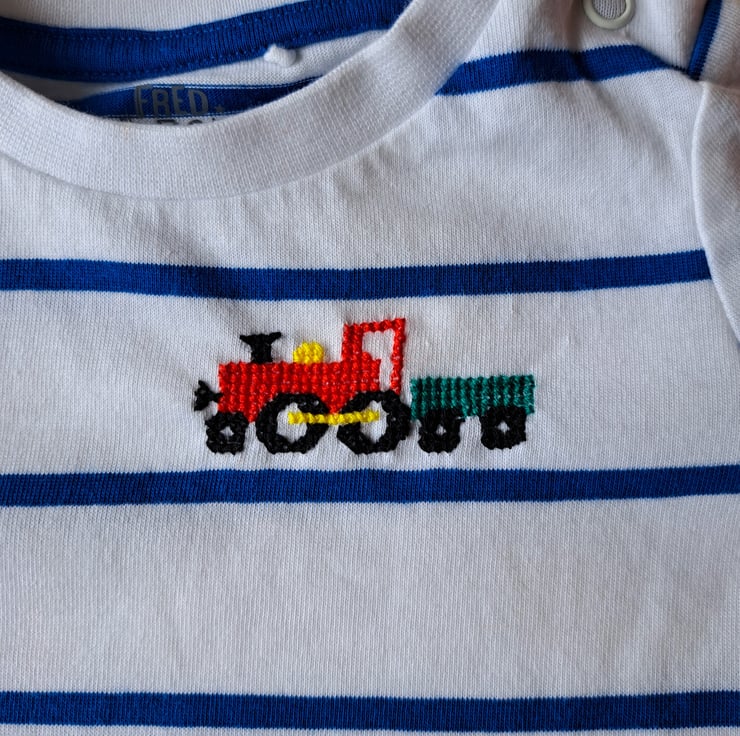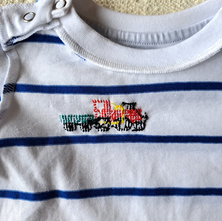 I have hand cross-stitched a red toy train pulling a kingfisher blue truck on the left front of this tiny t-shirt. It has a golden yellow dome and piston rod. As I never use a permanent backing material when hand embroidering kids' clothing, there is nothing inside to irritate your child's skin. The shirt is white with wide spaced narrow royal blue stripes. It has a round neck, short sleeves and two press studs on the left shoulder. Being all cotton, it can be machine washed.