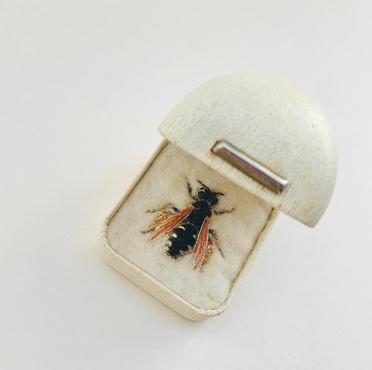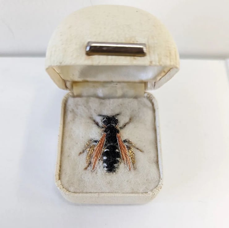 She is 3 x the actual size of the real bee. She is made from wool and vintage threads and sculpted into a cream vintage jewellery box, probable a ring box.