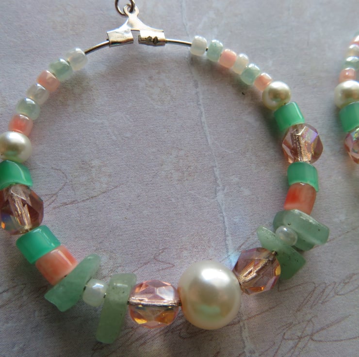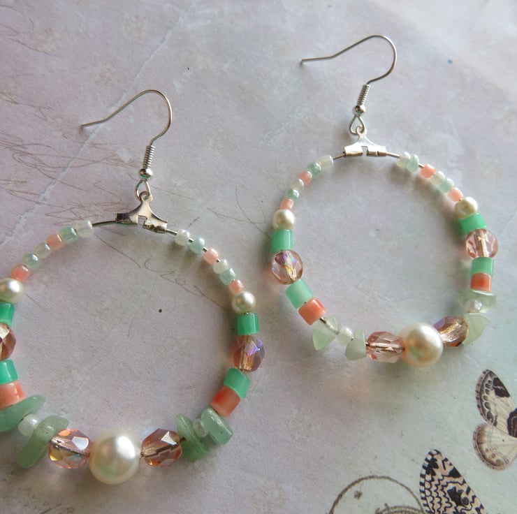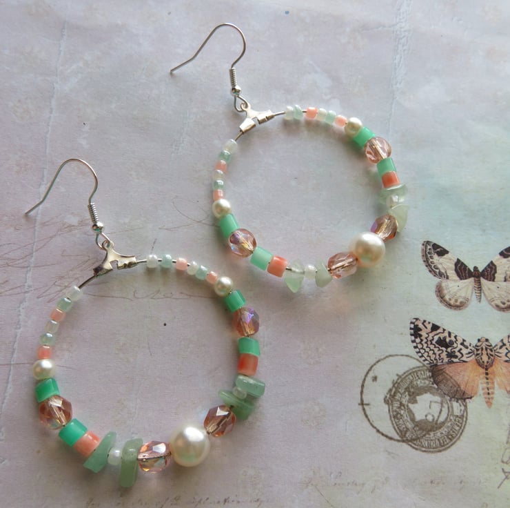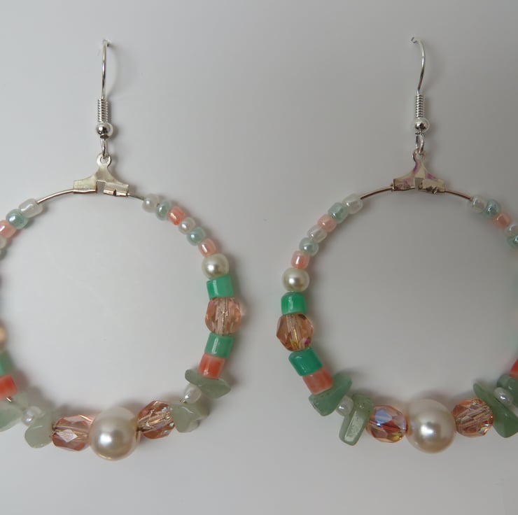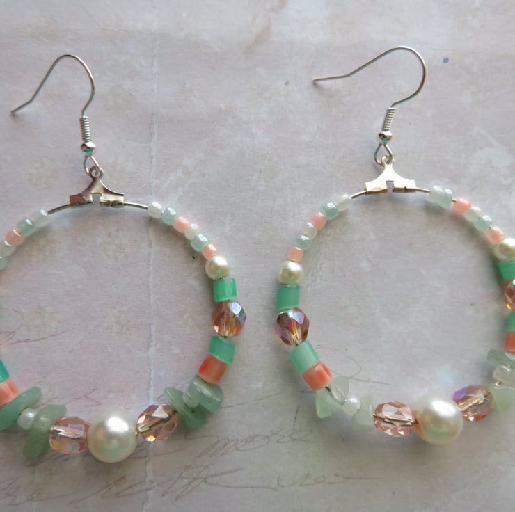 Each hoop is adorned with a mix of peach AB crystals, soft ivory & blush peach pearls, apricot and spearmint glass tubes and intricate ivory, peach and mint pearlized bugle beads, Aventurine gemstone chips beads, that all blend together to shimmer and catch the light beautifully.