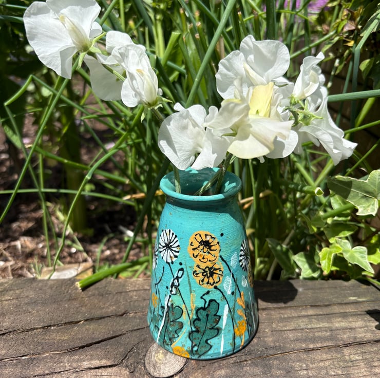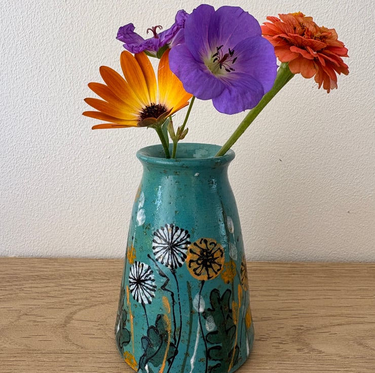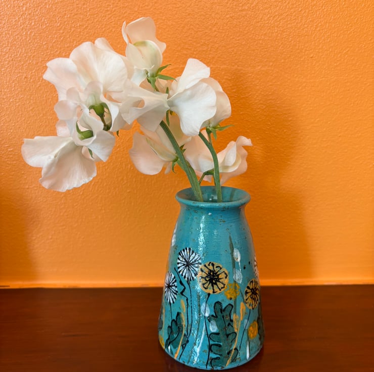 This design is inspired by No-Mow May and the wonderful dandelions that appear in the grass. I threw the vase on my potter's wheel in my studio at the bottom of the garden. The clay is a speckled clay which adds variety to the finish. I've used a sponge and the side of a credit card to make marks and then a needle end on a slip trailer to sketch outlines with underglaze. Finally the vase has been coated with a transparent shiny glaze and fired at 1200 degrees!