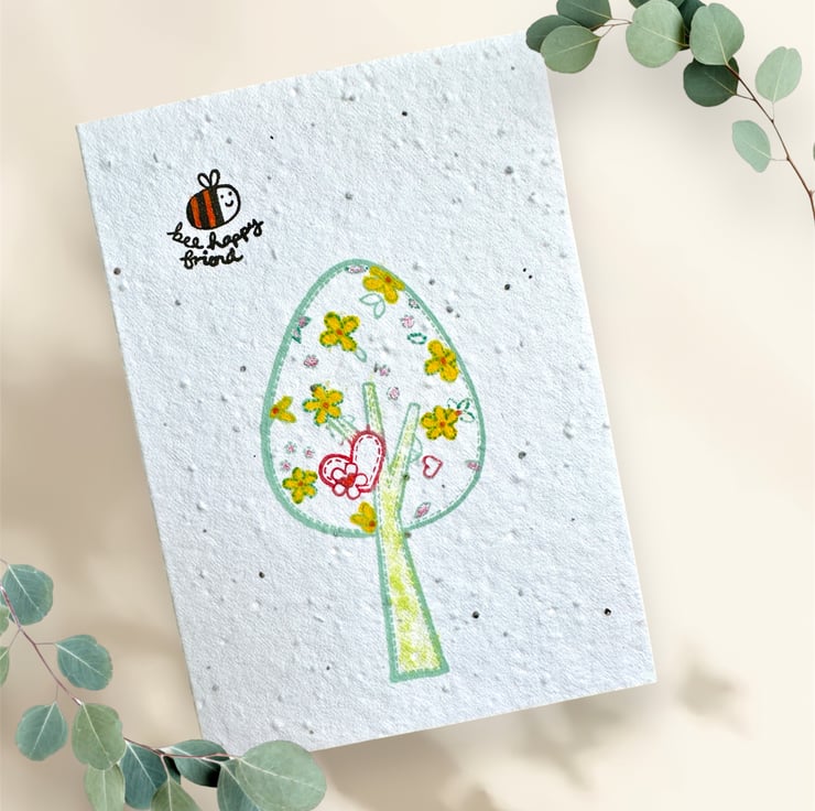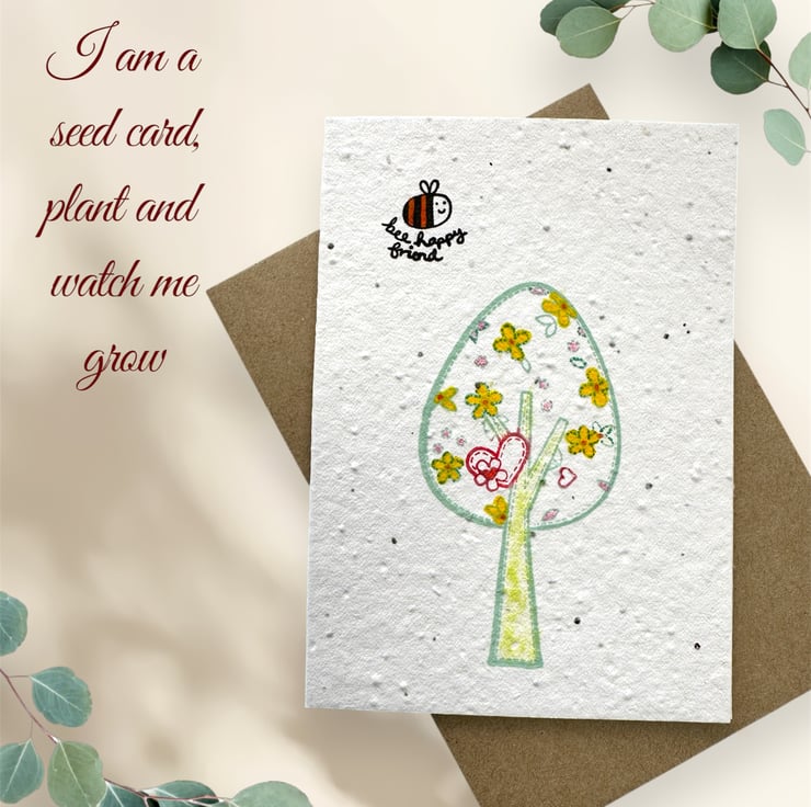 Seed card, blank with abstract tree and bee happy friend. Plantable eco scandi