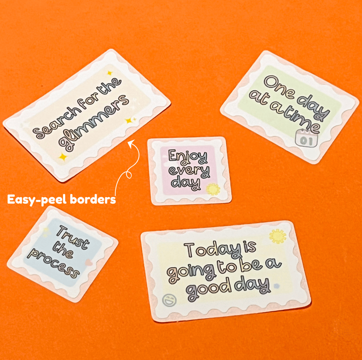 Add a little encouragement to your day with this set of five pastel affirmation stickers, each shaped like a mini postage stamp. Each sticker carries a gentle reminder to slow down, stay hopeful, and enjoy the moment.