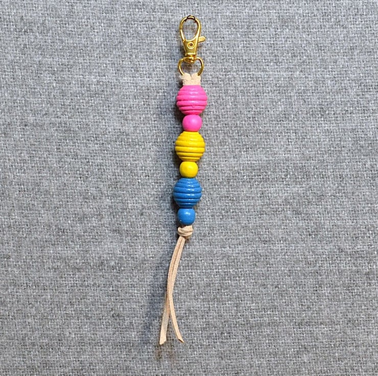 This is a cute little bag charm made with wooden beehive and round beads on beige suede cord, finished with a gold-coloured lobster clasp/lanyard clip. The charm is approximately 14cm, or 5 1/2 inches, long.