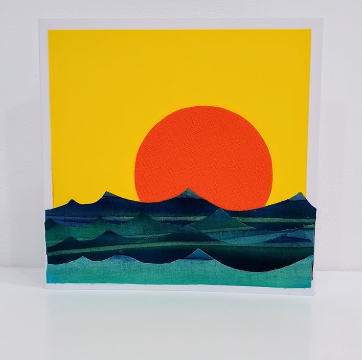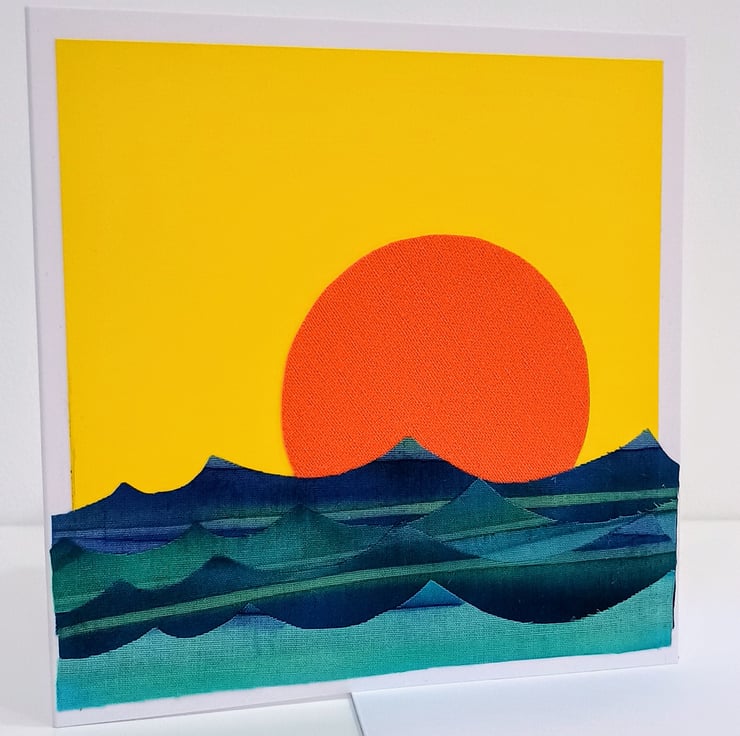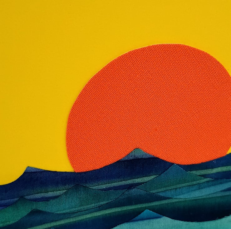A blank greetings card featuring a vibrant orange setting sun, disappearing behind the waves at the end of another day. Created using bright cotton and batik fabrics, handmade and unique.