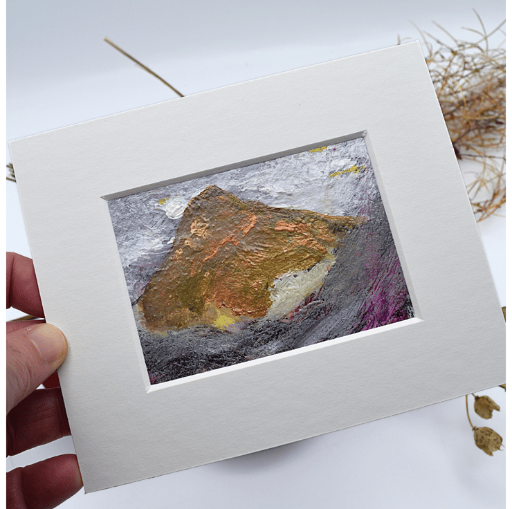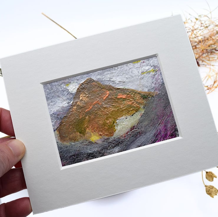 This is a small mounted landscape painting in acrylics. The sky is a clear blue and a large mountain dominates the scene. I have used a combination of brushes and my fingers to apply thick layers of acrylic paint on to the sealed paper. This will make an ideal letterbox gift.