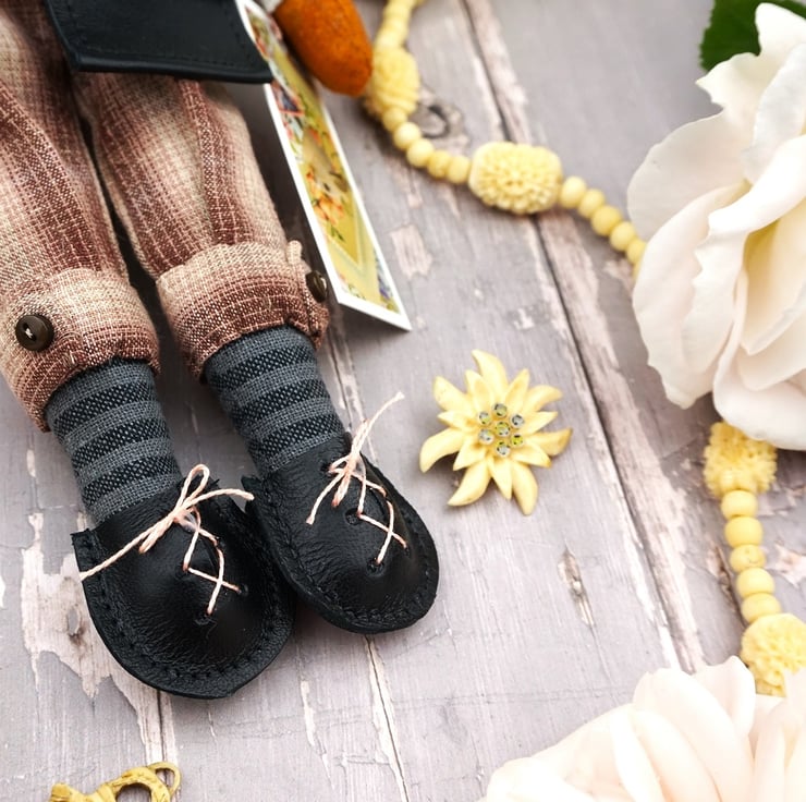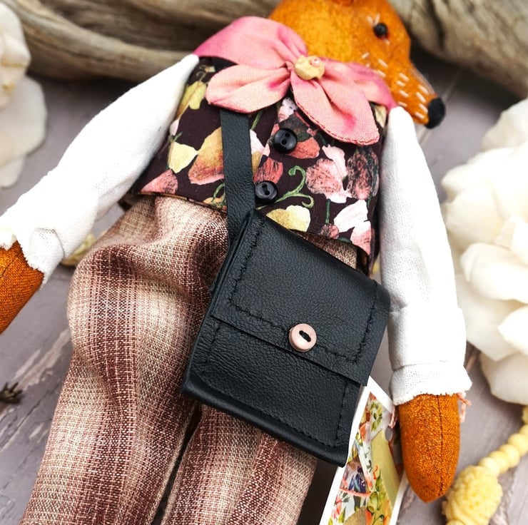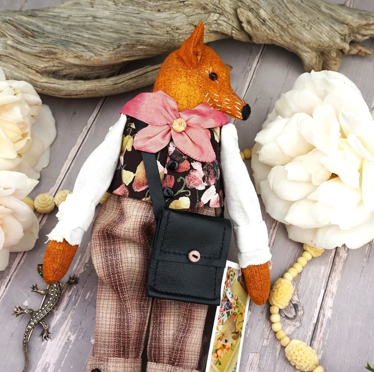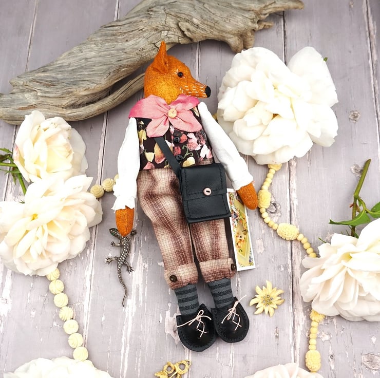 Rollo is a tiny gentleman fox dressed in a lovely Liberty print called Sweet Mifnight in black ground with sweet peas in corals and creams with coordinating yarn dye plus fours. He has rosemary in his stuffing, hand embroidered features with a little foxy tail. He has a carnelian crystal at his heart for warmth and is finished with tiny buttons, a leather bag with little leather shoes.His shirt is white linen and his cravat is rich coral silk.