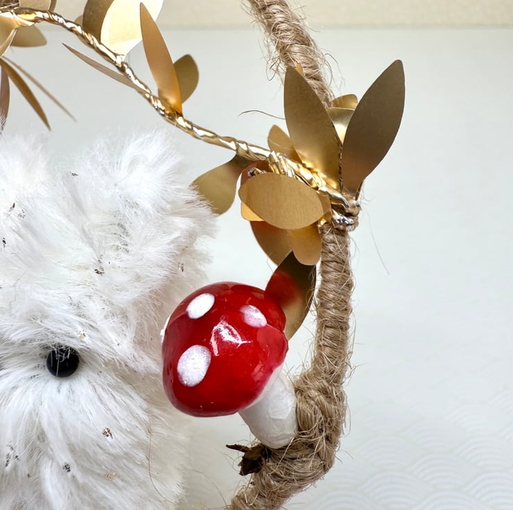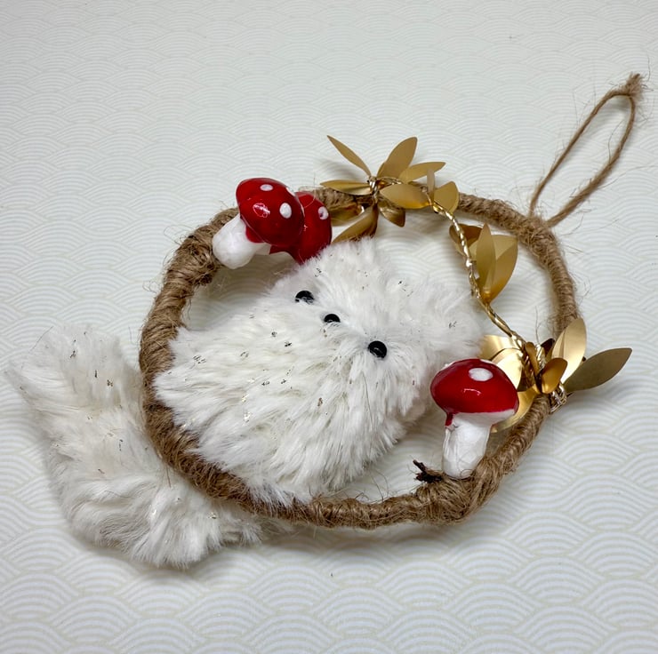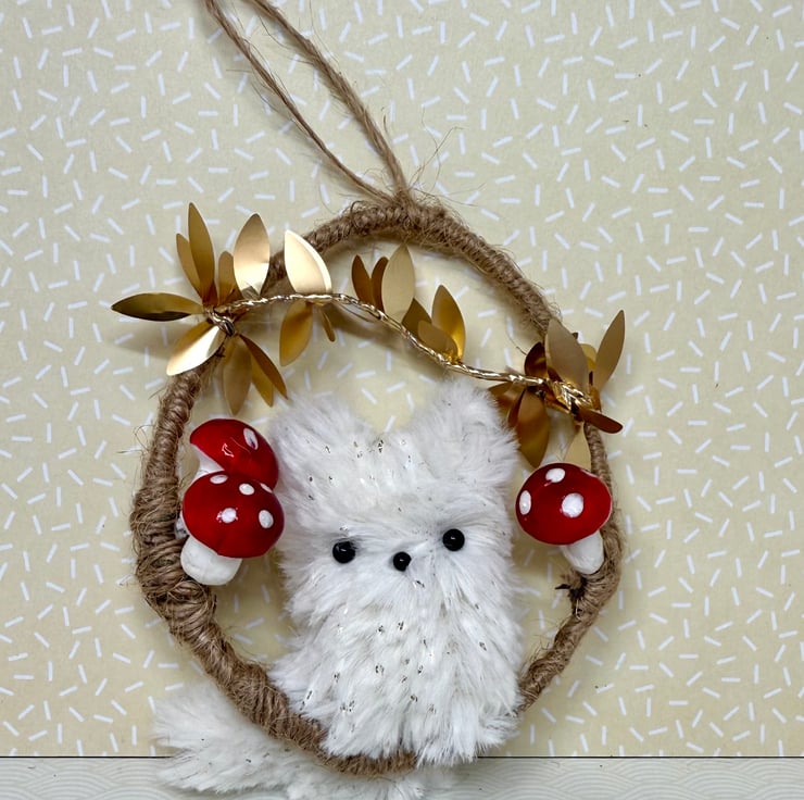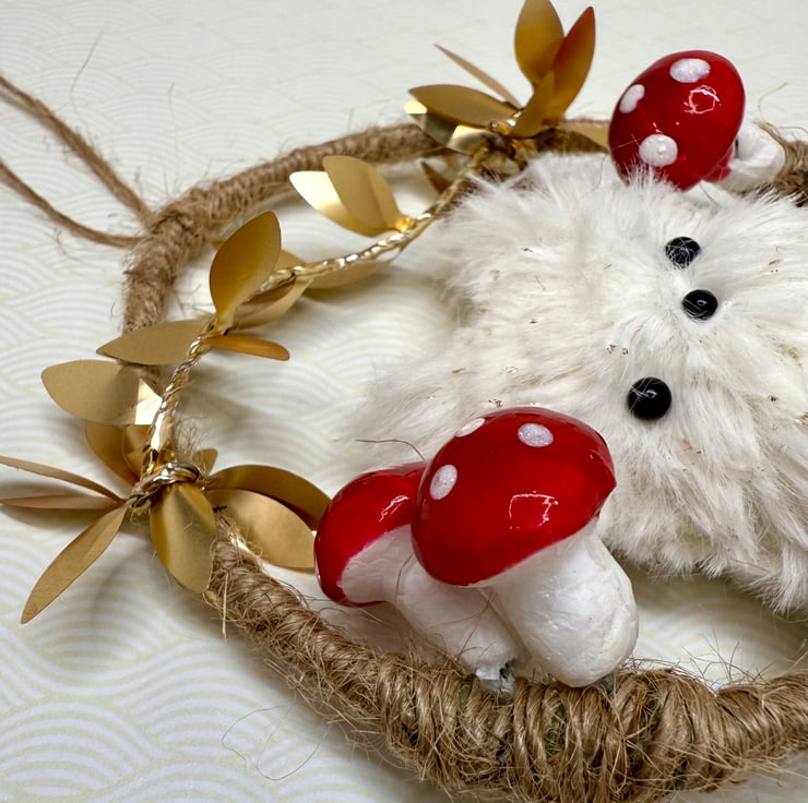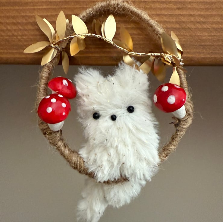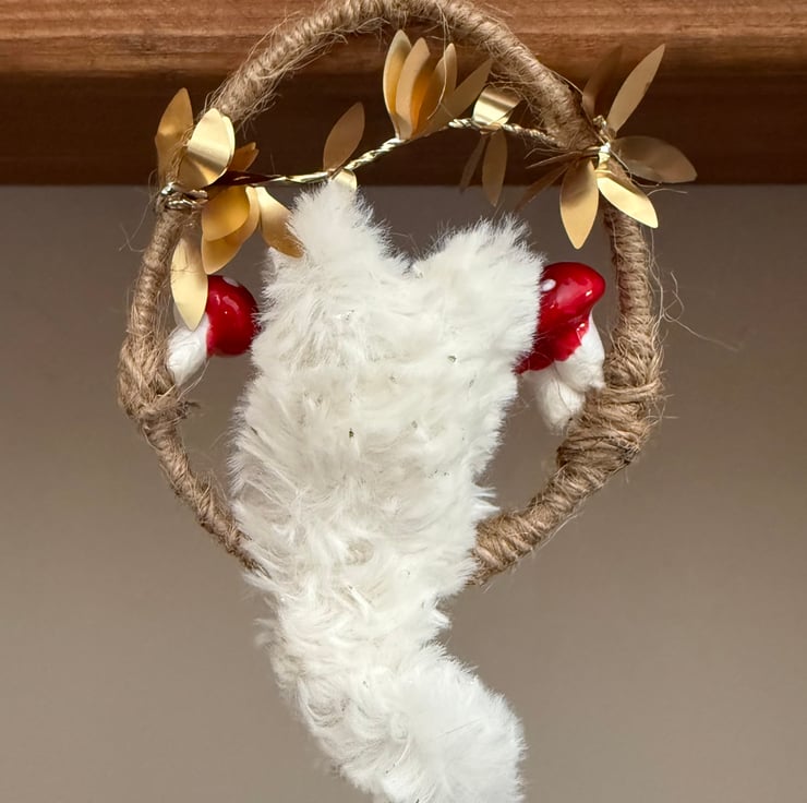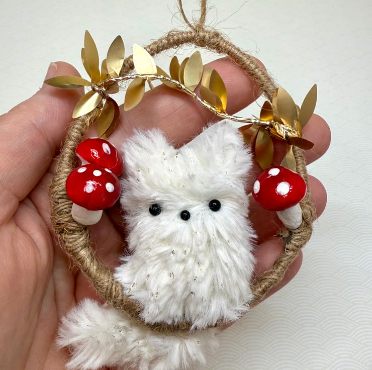 Handmade miniature plush fox with bead eyes and nose mounted in an upcycled hoop covered in jute string. Hoop has a diameter of roughly 7.5cm. Fox is made from soft faux fur with gold flecks. The fox tail twists and hangs below the hoop. The hoop is adorned in wired trim with shiny metallic leaves and red and white polystyrene toadstools. This hoop comes with jute string loop hanger attached.