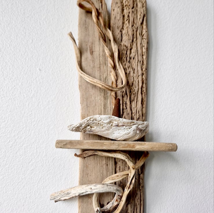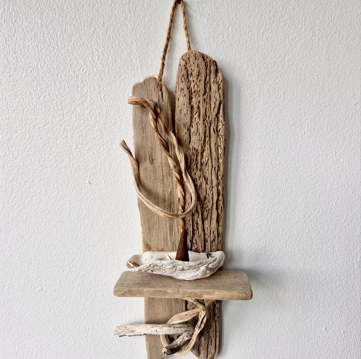A unique wall hanging Driftwood Incense Cone Burner. Handmade by myself using driftwood & Dried Seaweed collected from the Dorset Coast & an Oyster Shell on which to sit your chosen Incense Cone. Complete & ready to hang with plaited Jute hanger. Size 30cm high x 10cm wide. Commissions welcome. Any questions please feel free to ask..