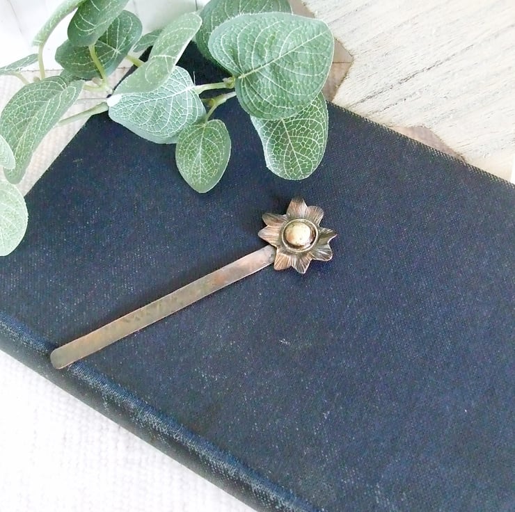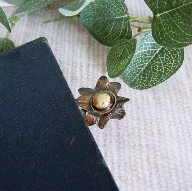 Bookmark, copper flower with jasper gemstone and sterling silver centre.