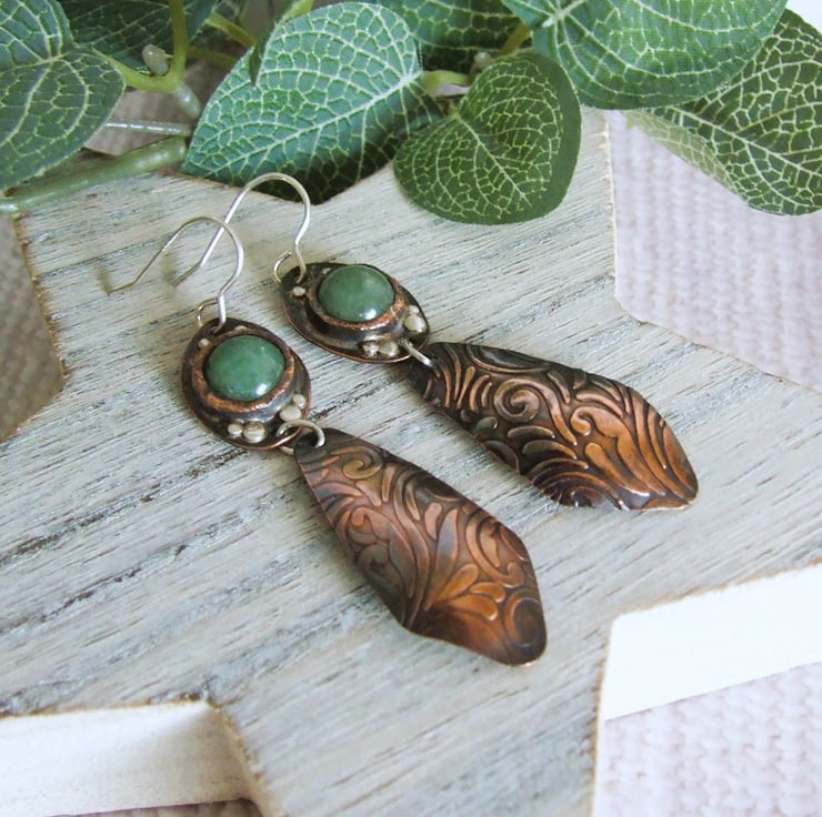 I have created the shapes from copper sheet, hand cut and embossed with a pattern. I then slightly domed the shapes and then added some silver beads. The top part is a copper base with silver beads, set with a 10mm green aventurine gemstone. Finished with silver ear wires and an oxidised finish.