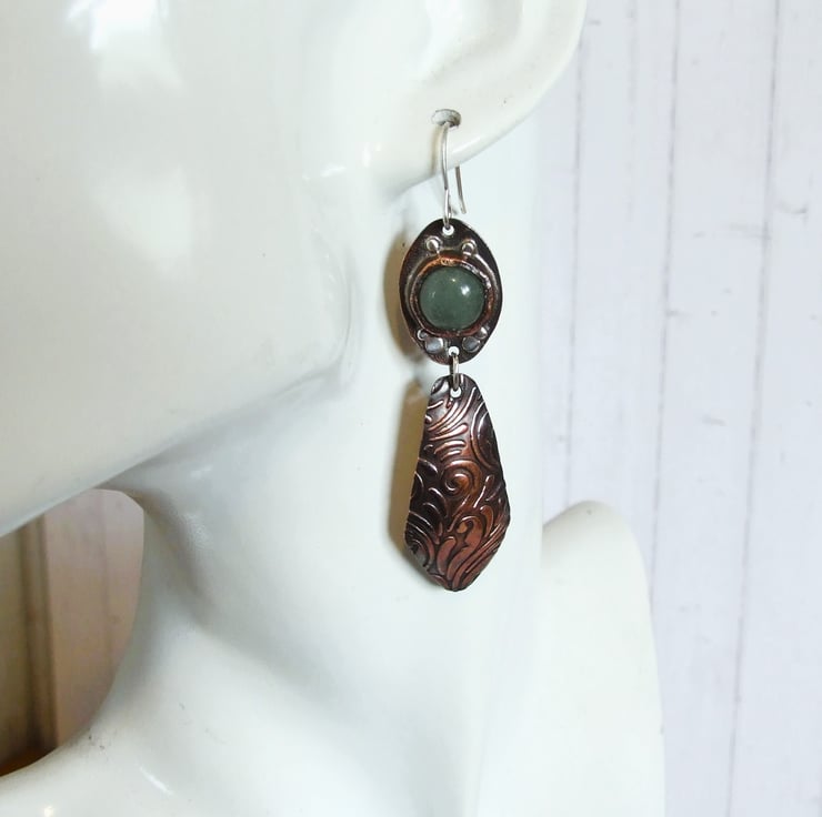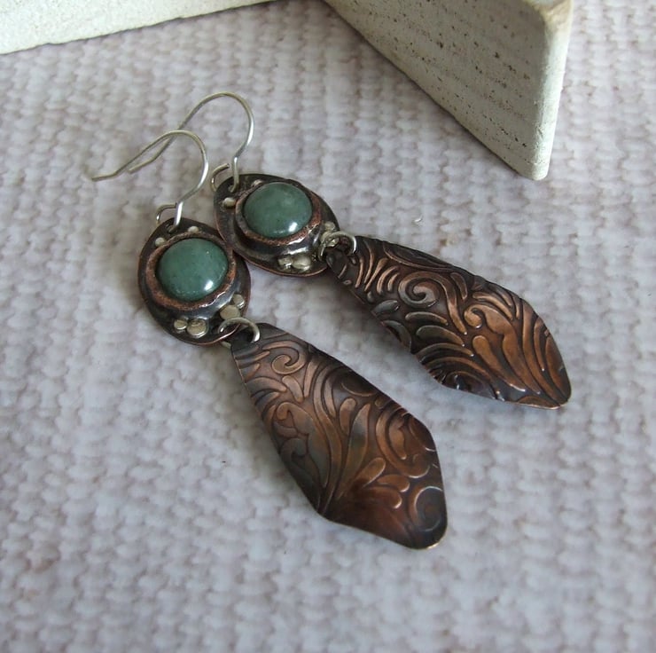 Sterling Silver and Copper Embossed Patterned Dropper Earrings. Copper paired with green aventurine gemstones and silver elements.