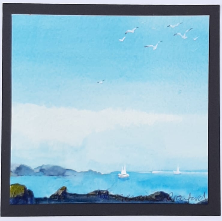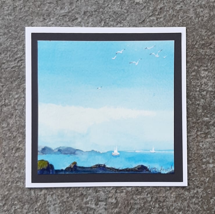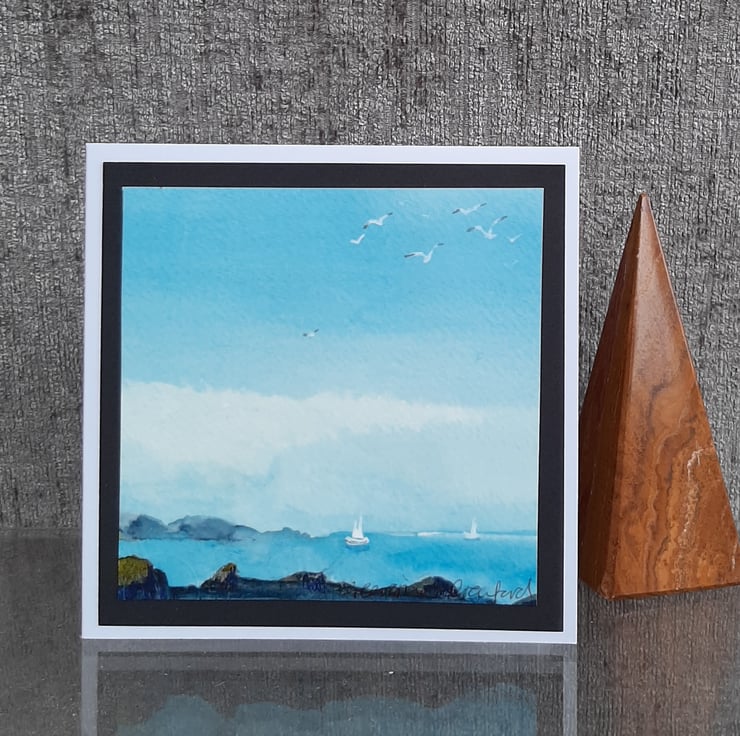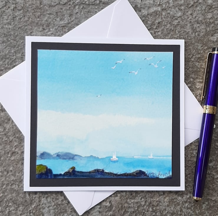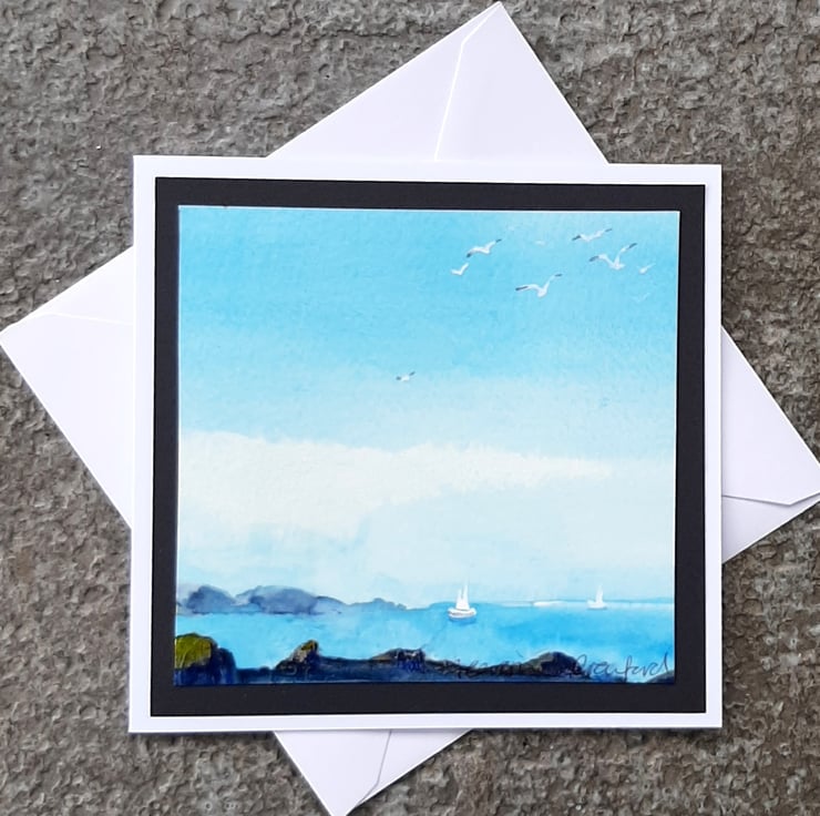 Beautiful handpainted watercolour card of yachts on the ocean.