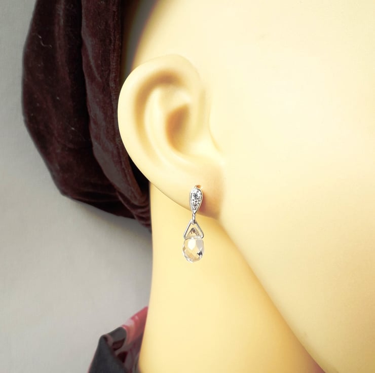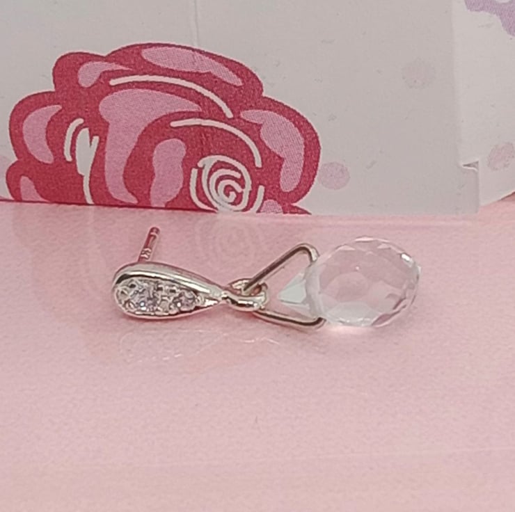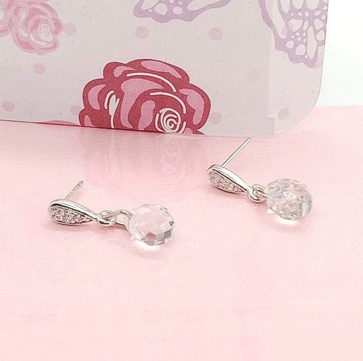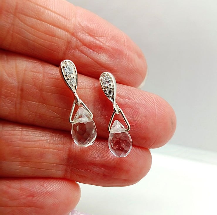 Sterling silver faceted clear quartz briolet drop earrings on a sterling silver stud fitting with cubic zirconia detail.