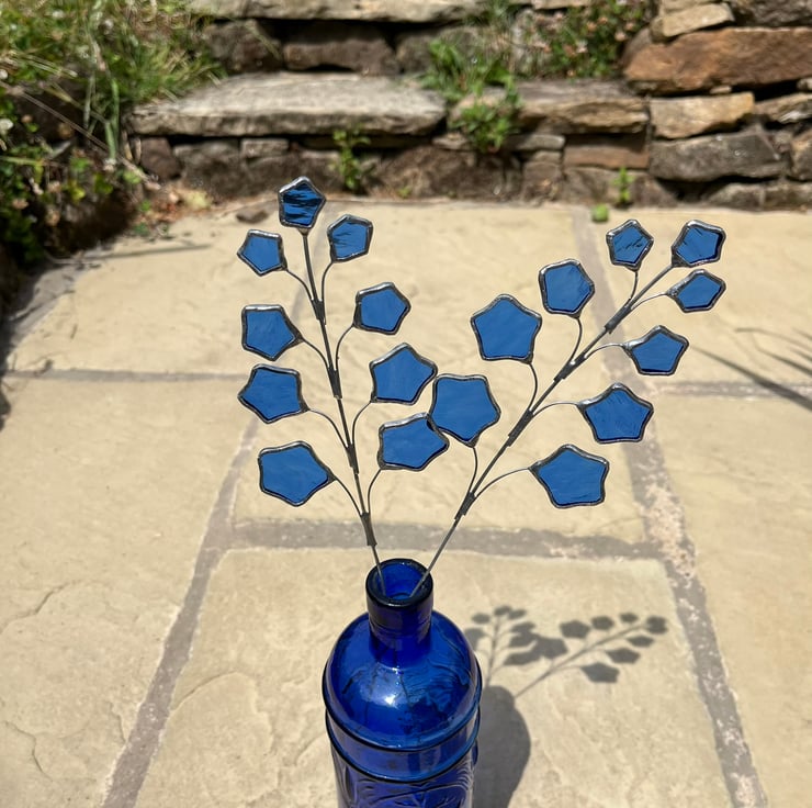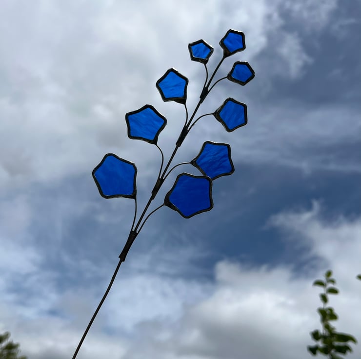 A beautiful, elegant stained glass delphinium on a wire stem. Featuring 9 blue flowers on stalks, decreasing in size to the top of the stem. Each flower is individually hand-crafted from textured blue stained glass.