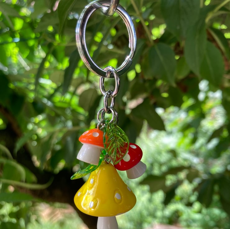 Hangs 8cm long comprising of one big 2.5cm toadstool and two 15mm little ones with green leaves for that little bit of jangle.