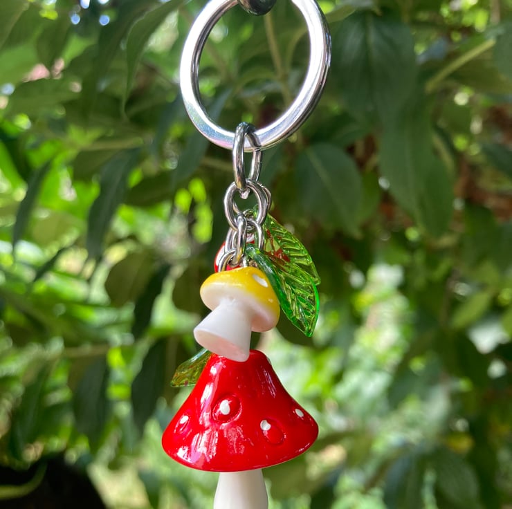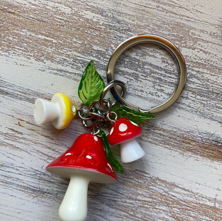 Hangs 8cm long comprising of one big 2.5cm toadstool and two 15mm little ones with green leaves for that little bit of jangle.
