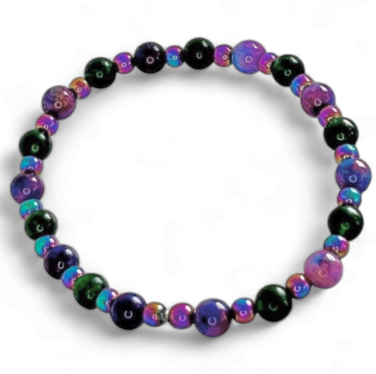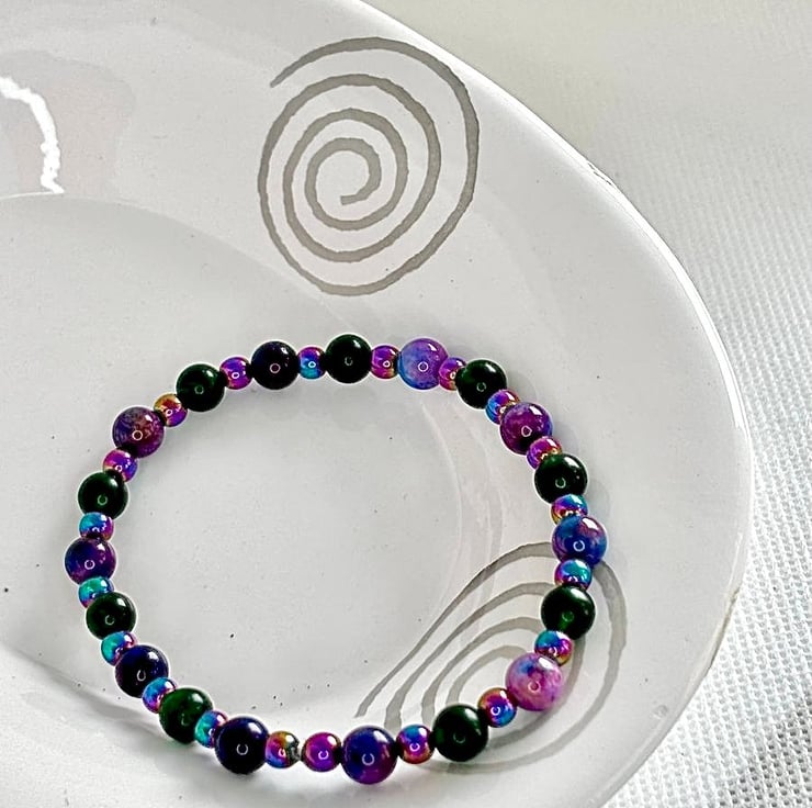 Brighten up your accessory collection with this stunning handmade stretch bracelet, featuring 6mm Dark Green Jade and vibrant Starry Night Sugilite gemstones. The eye-catching 4mm rainbow Hematite beads add a dazzling touch, making the green and purple hues truly pop. Designed for comfort, this elasticated bracelet fits wrists comfortably between 7-8 inches, making it a fabulous gift for anyone who loves colour and unique style.