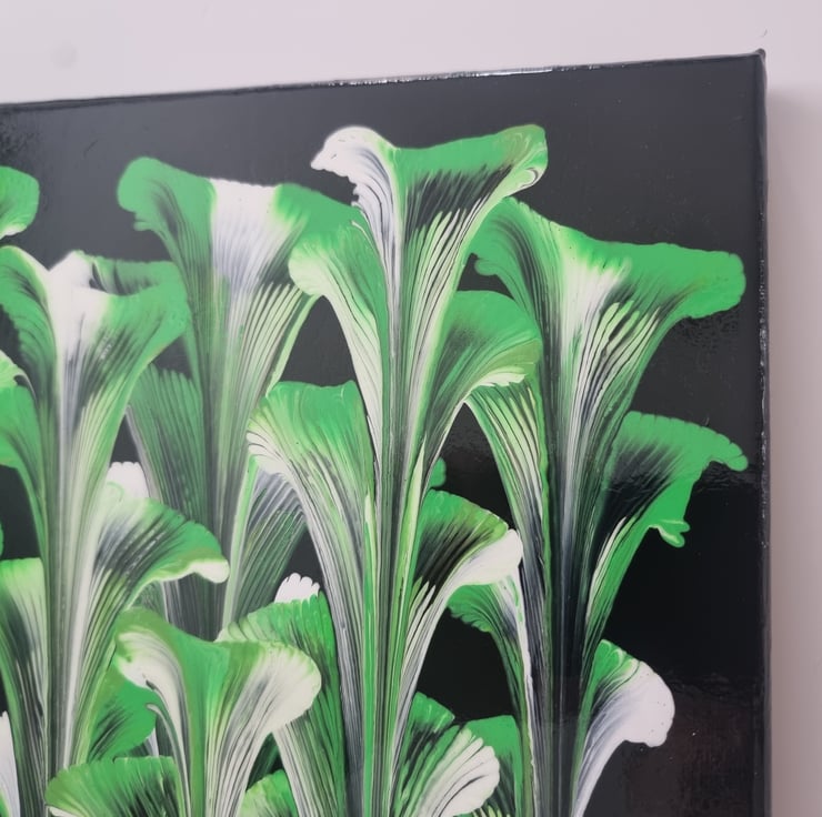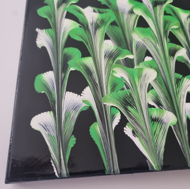 This is the first in a series of three pictures, created using Pull techniques. This is a Fine-Chain-Pull. Paint is loaded onto the chain, which is then arranged on the canvas and pulled/guided to the bottom of the picture. It takes some amount of practice and the paint consistency can be crucial. The simple green and white colours work well on a black background and required five pulls.