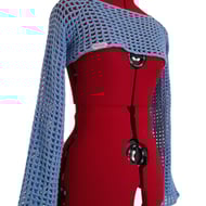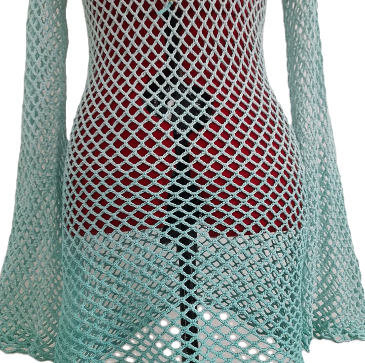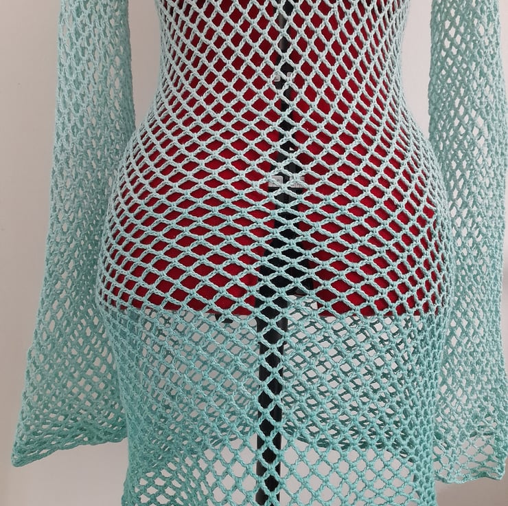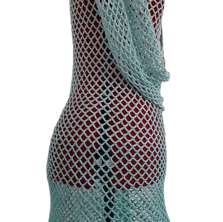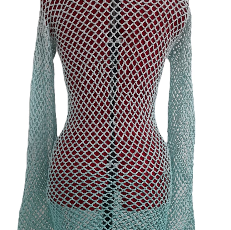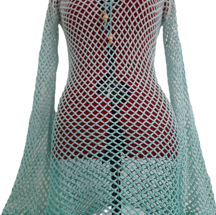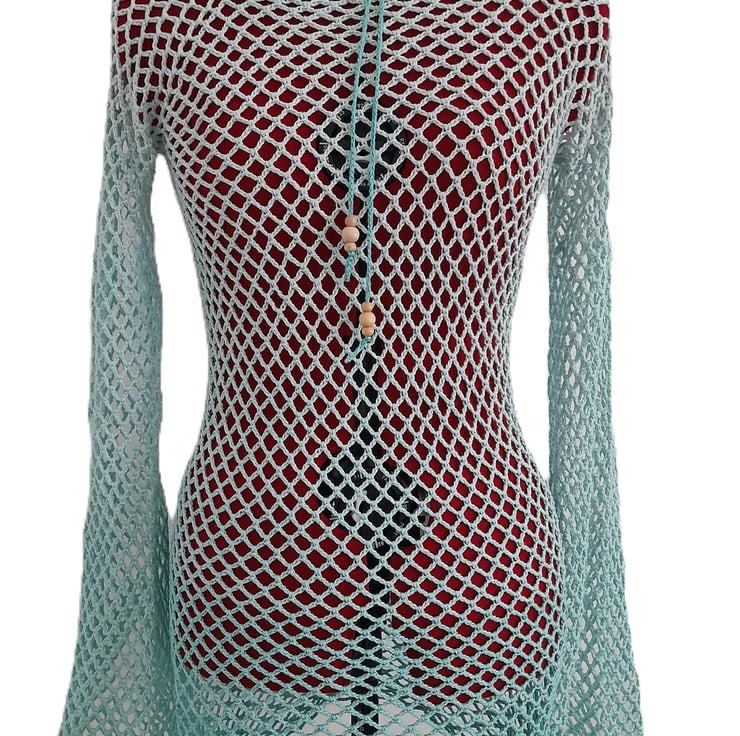 This see-through mesh dress is perfect as a beach cover-up or a festival tunic. It features extra-long sleeves, designed on purpose to softly cover your palms for a relaxed, boho look. The colour gently fades from a light mint green to a lovely turquoise. It has a cute lace-up detail at the neck with wooden beads.
