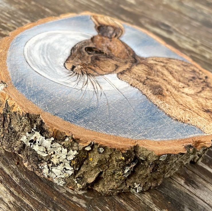 ‘Buck Moon’ - Wood-Burned, Moon-Gazing Hare with a Soft-Wax Pencil Full Moon and Sky on a Solid Log-Slice - Wall Art