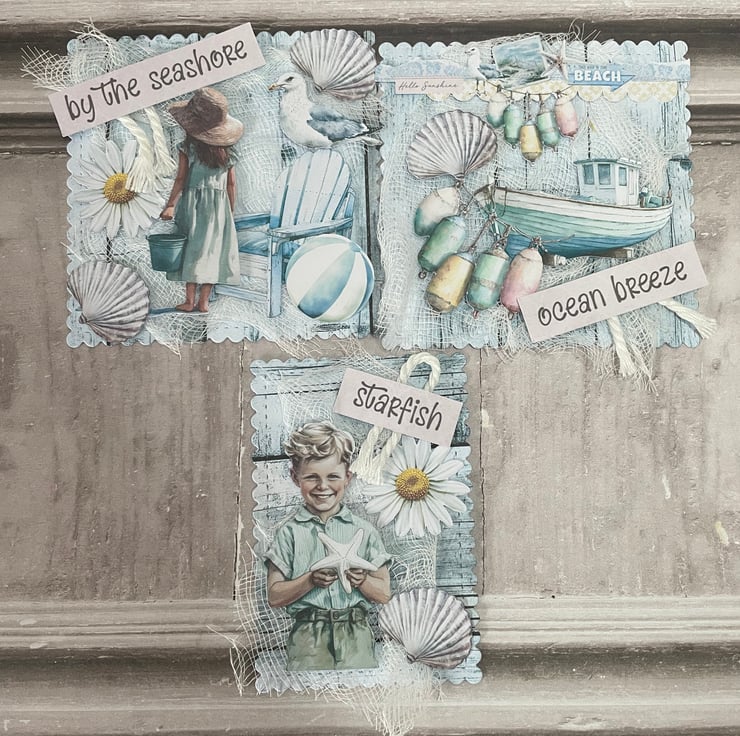 Summer card toppers, set of 3. Bleached board backing. Cheesecloth, holiday themed elements and wording. Perfect to add to card blanks or other craft projects.