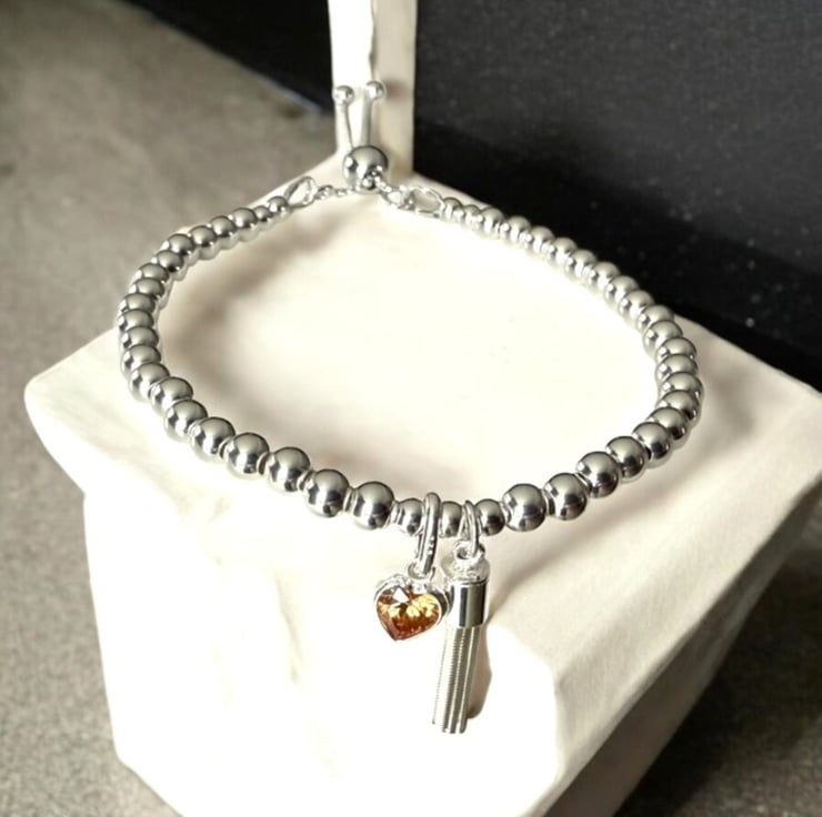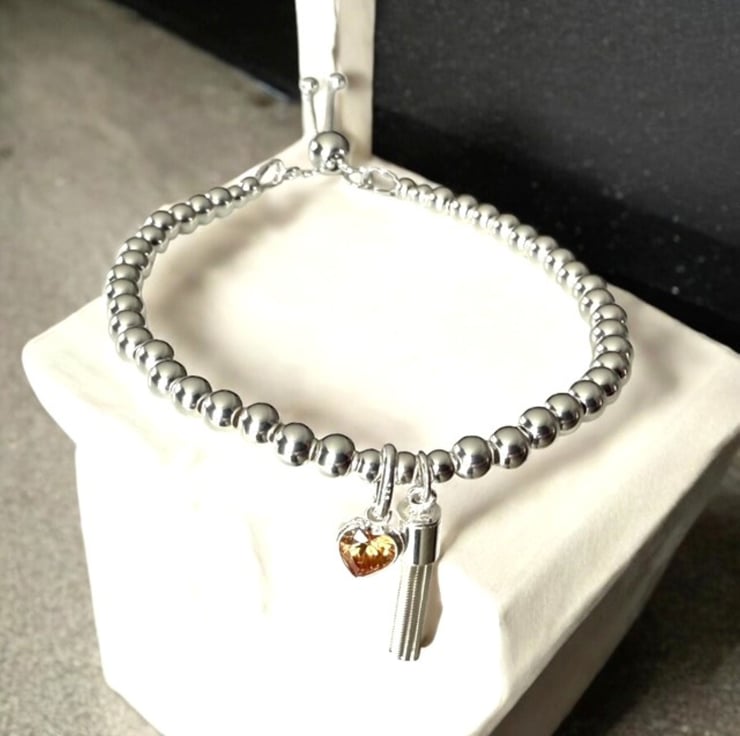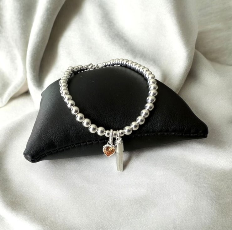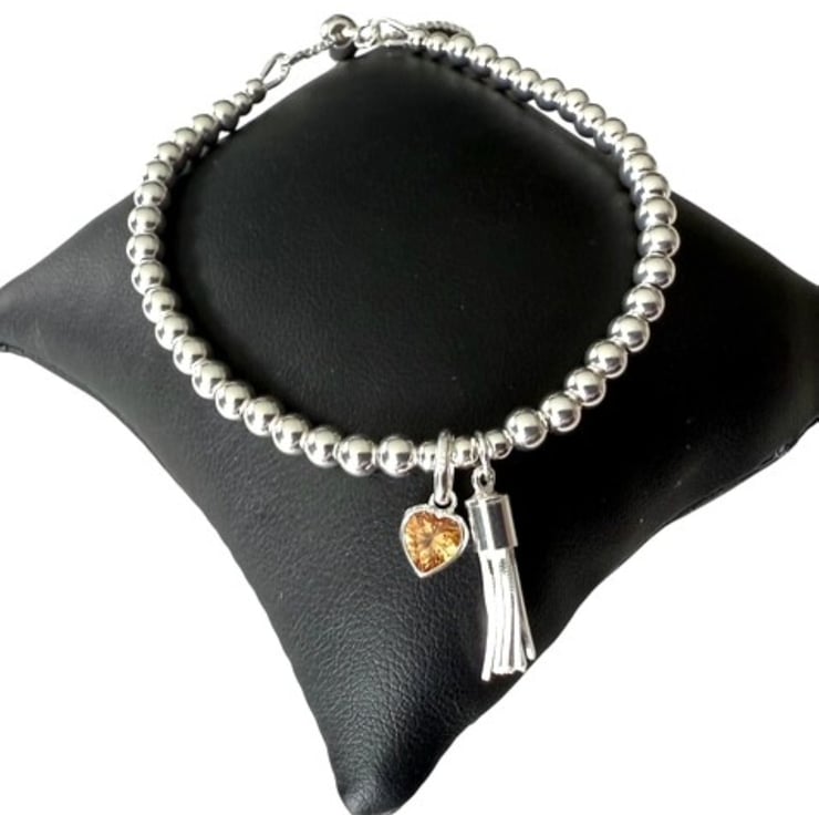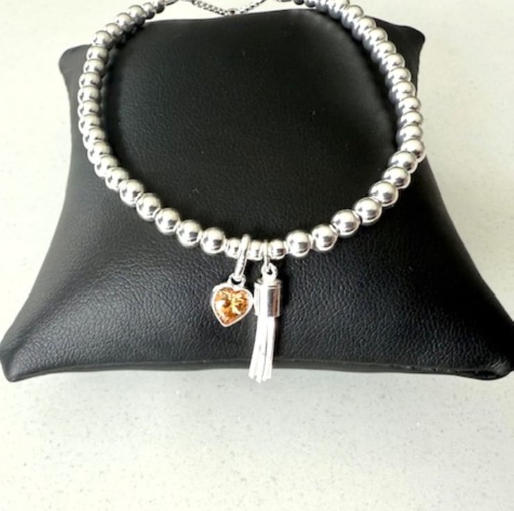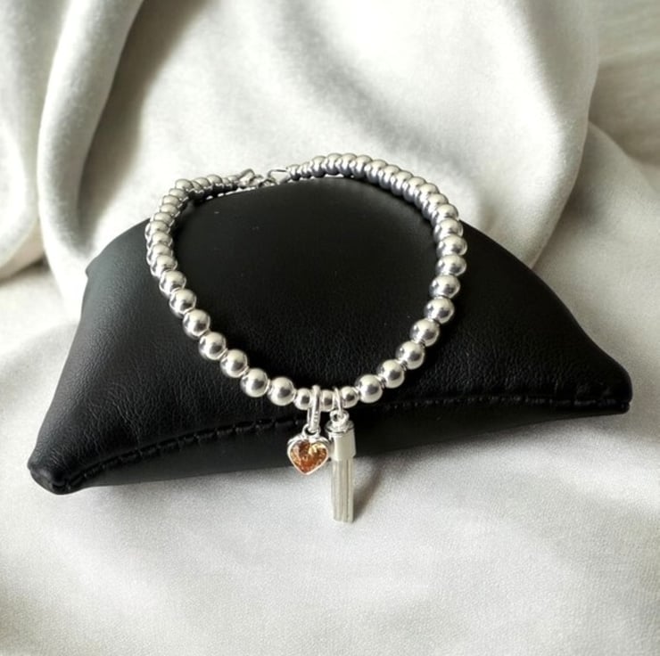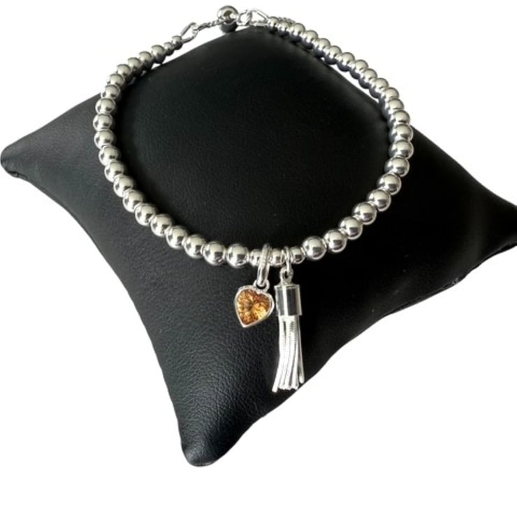 This handmade sterling silver bracelet is full of warmth, sparkle, and thoughtful detail. Strung with 4mm polished sterling silver beads, it features an orange CZ citrine heart charm—the symbolic birthstone for November—alongside a playful tassel charm that moves gently as you do.