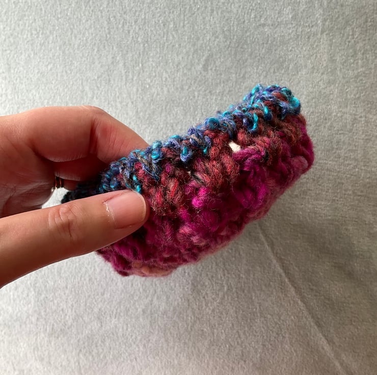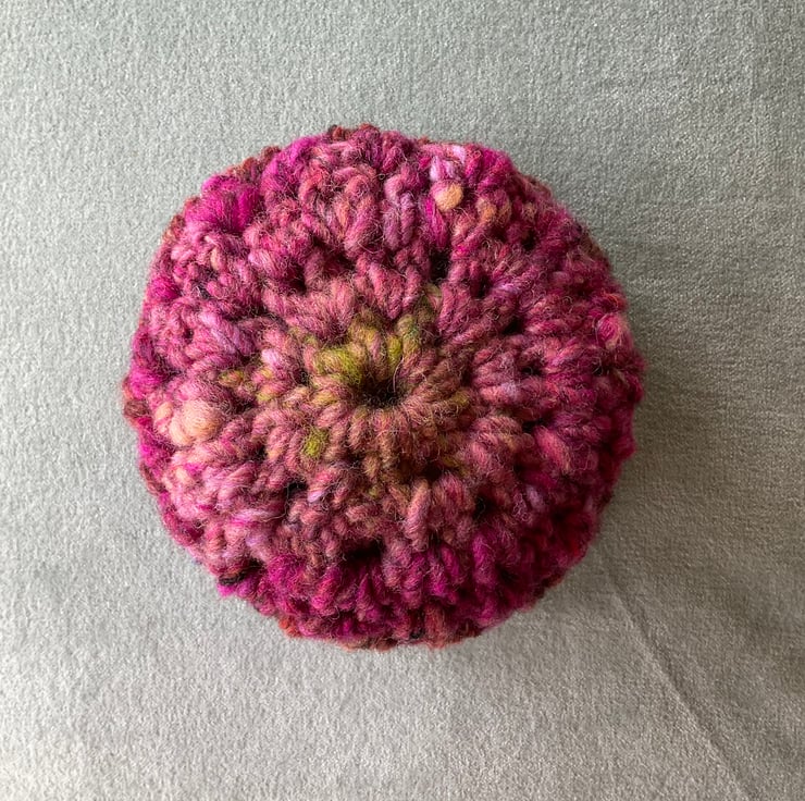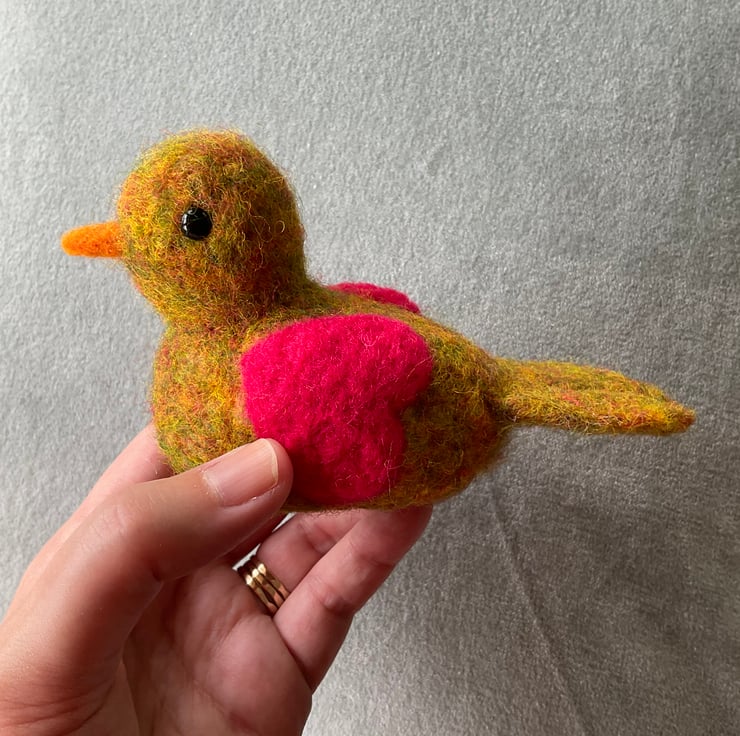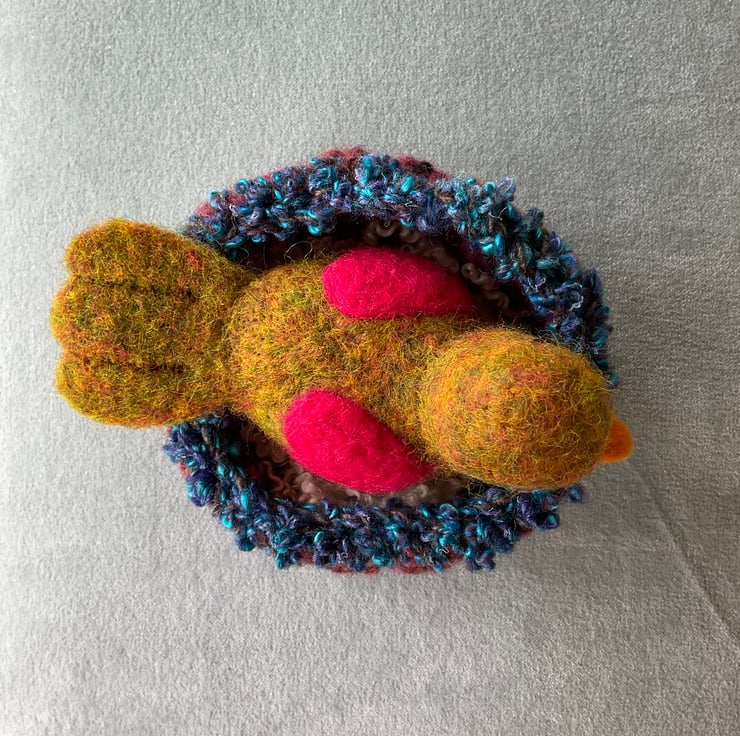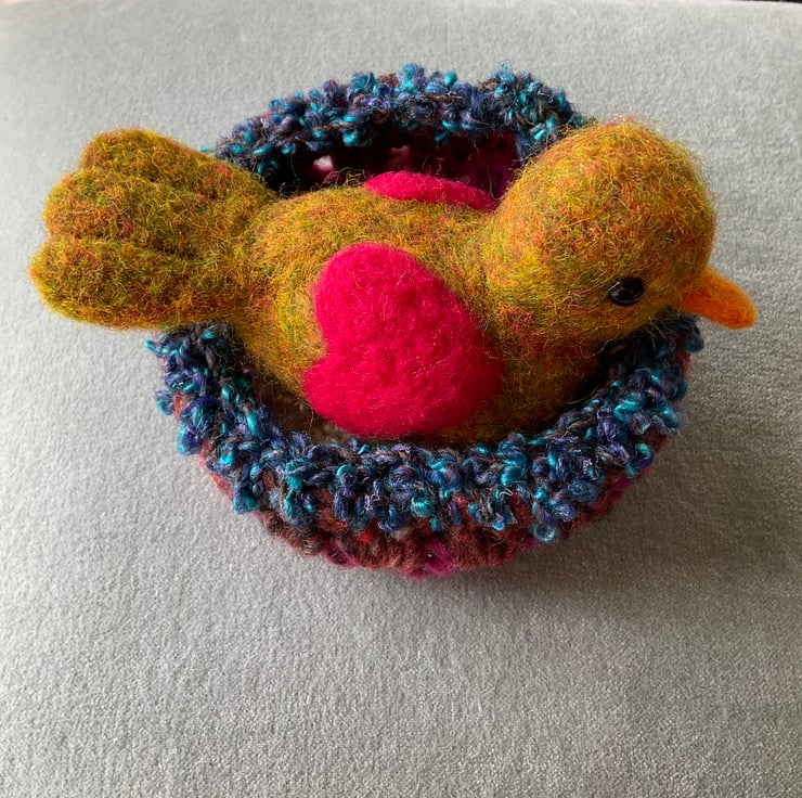 Made by needle felting ethically sourced wool fibres, with glass eyes. The nest is crocheted from luxury Japanese Noro yarn and lined with removable Bluefaced Leicester curls.