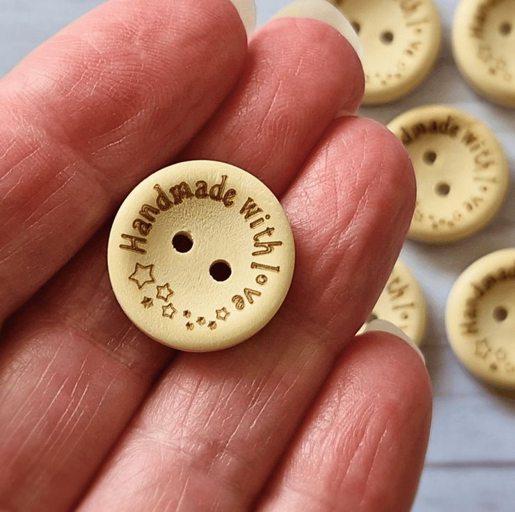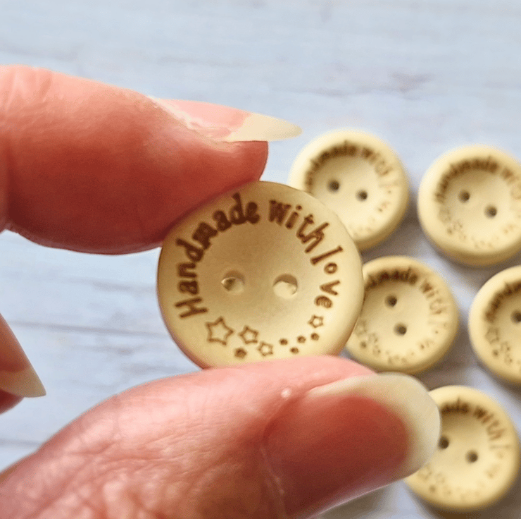 Handmade With Love wooden buttons. Measuring 20mm with a added stars printed on them, they’re perfect for baby makes like cardigans, keepsake gifts, or holiday accessories.